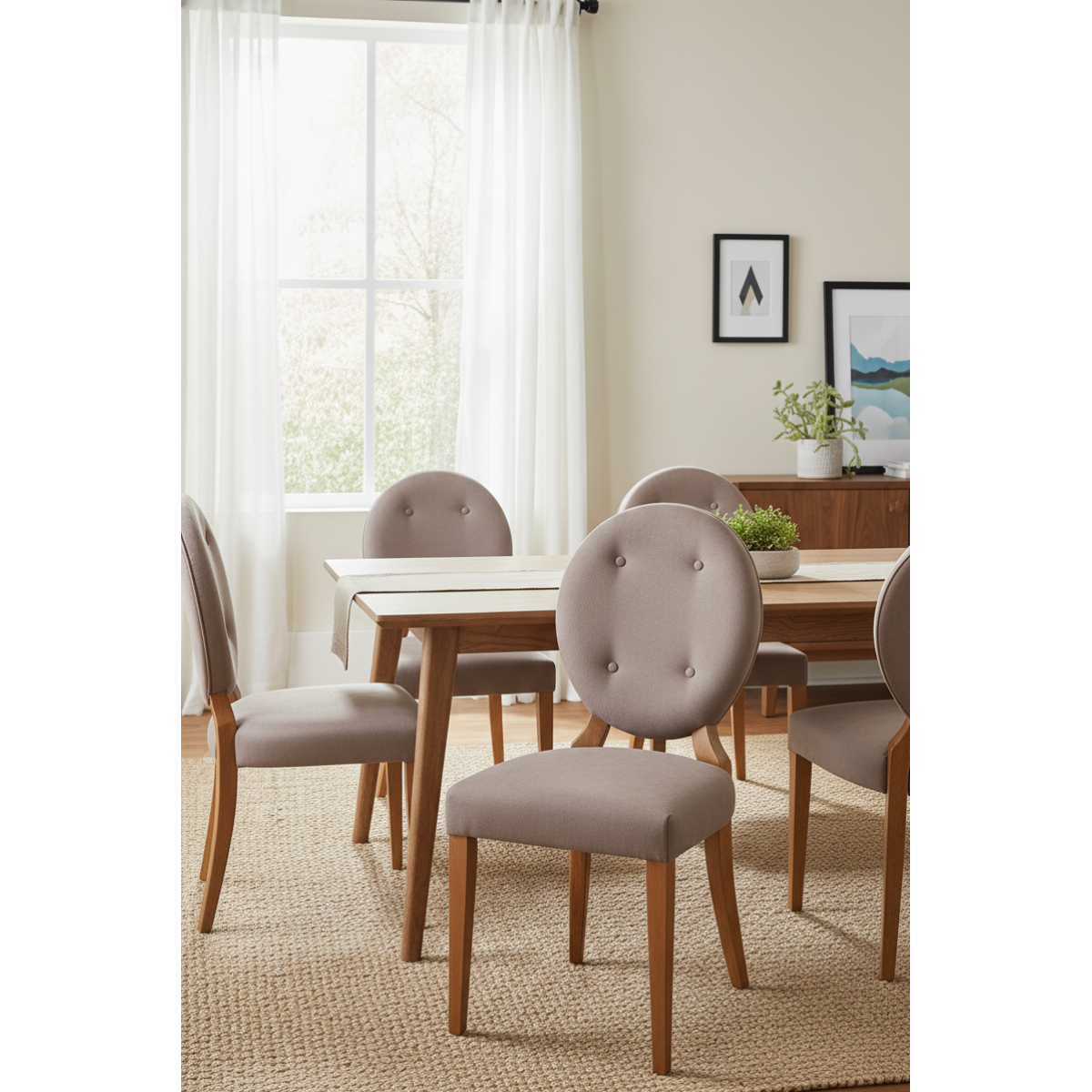 The Luxury Beige Velvet Upholstered Dining Chair with Button-Tufted Back and Elegant Wooden Legs combines classic design with modern elegance. Upholstered in soft beige velvet, this chair features a stylish button-tufted backrest that enhances its visual appeal. The wooden legs complete the design with a natural, warm finish, grounding the chair with timeless elegance. This luxury upholstered dining chair offers the perfect blend of comfort and sophistication, making it ideal for both casual and formal dining spaces.