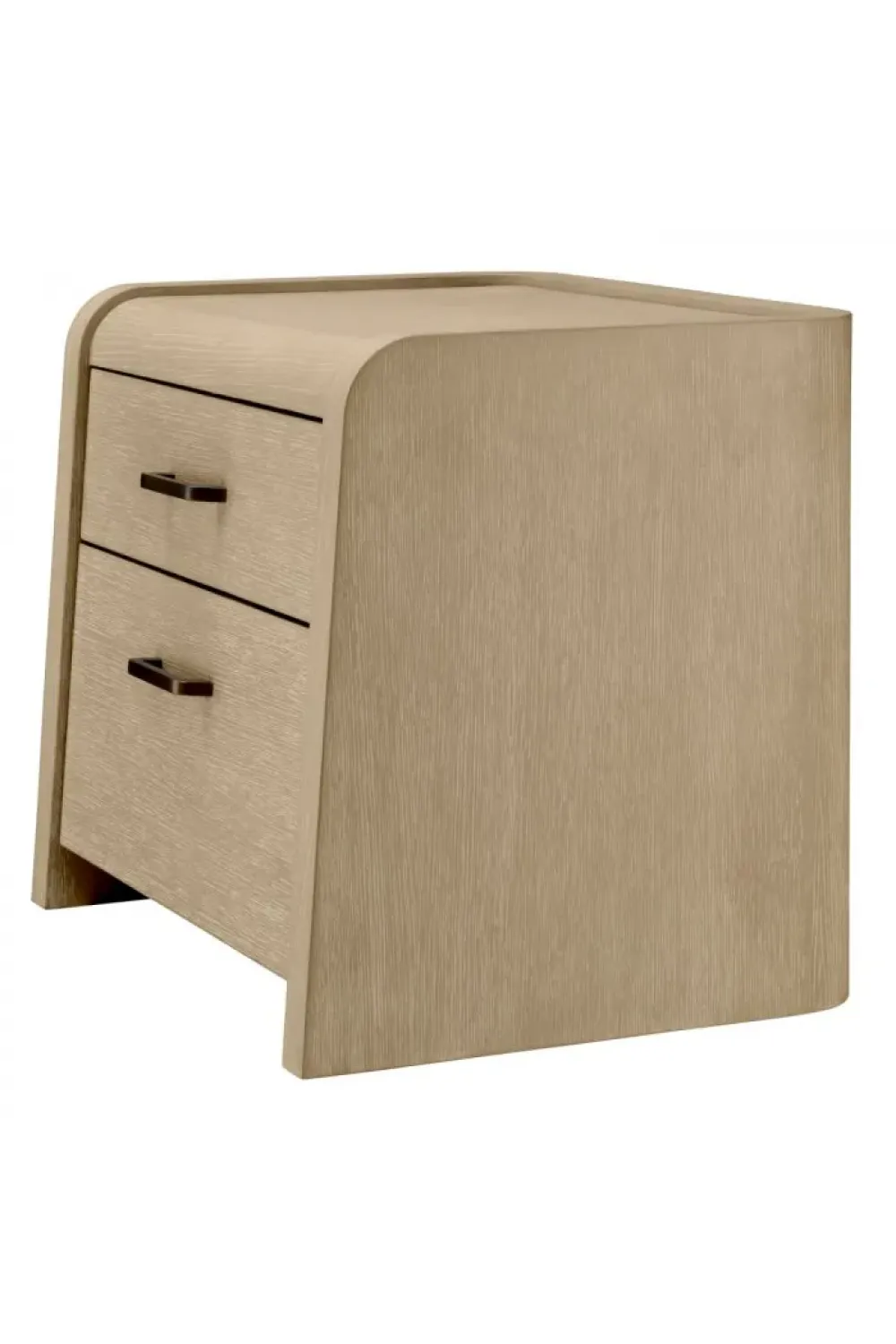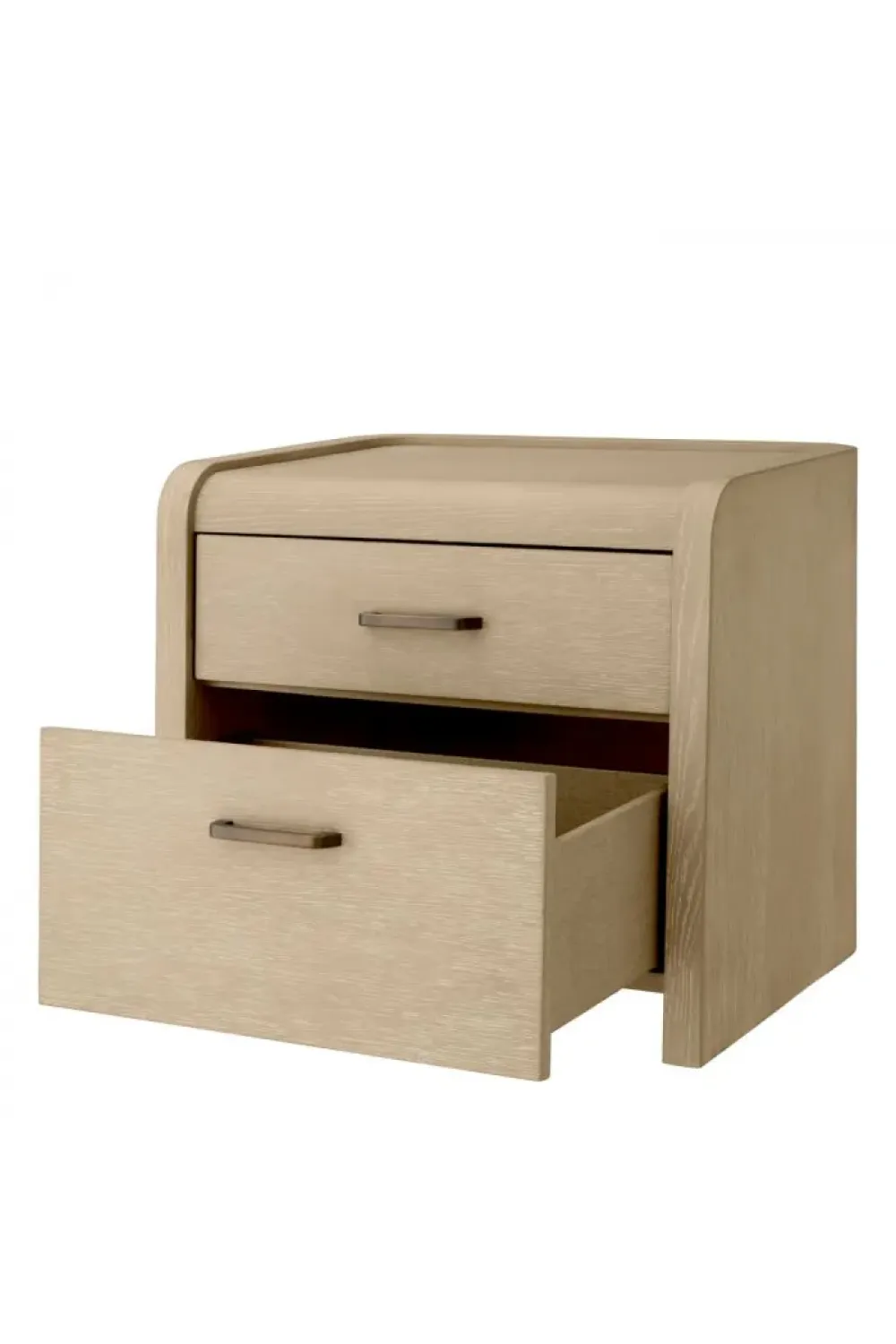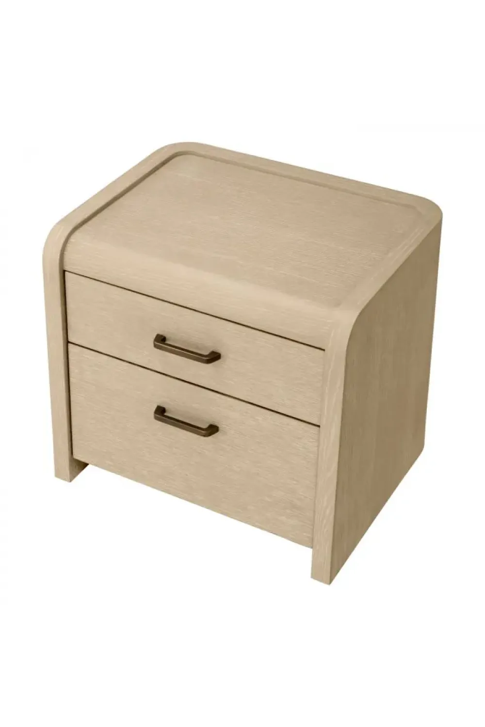 Luxury beige washed oak veneer nightstand with medium bronze finish designed for refined European interiors. Sleek washed oak veneer surface paired with warm bronze detailing creates timeless elegance. Two smooth luxury nightstand drawers provide discreet bedside storage.