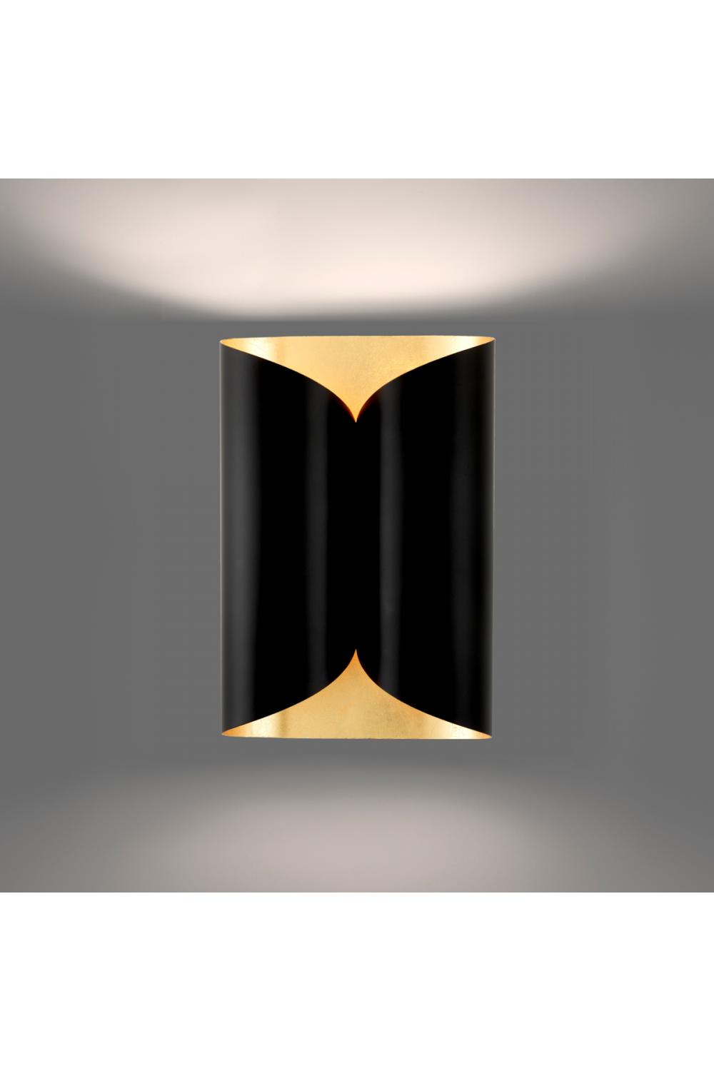 The defining feature lies in its carefully engineered folded construction, where fluid curves and sharp lines meet in perfect balance. Finished in deep matte black on the exterior, the lamp reveals a luminous gold-toned interior that reflects light softly and warmly. As a wall lamp with intriguing folded design, it produces a captivating interplay of shadow and glow, enhancing architectural depth.