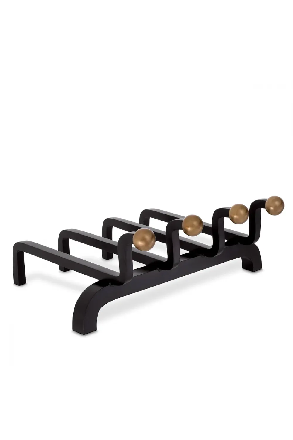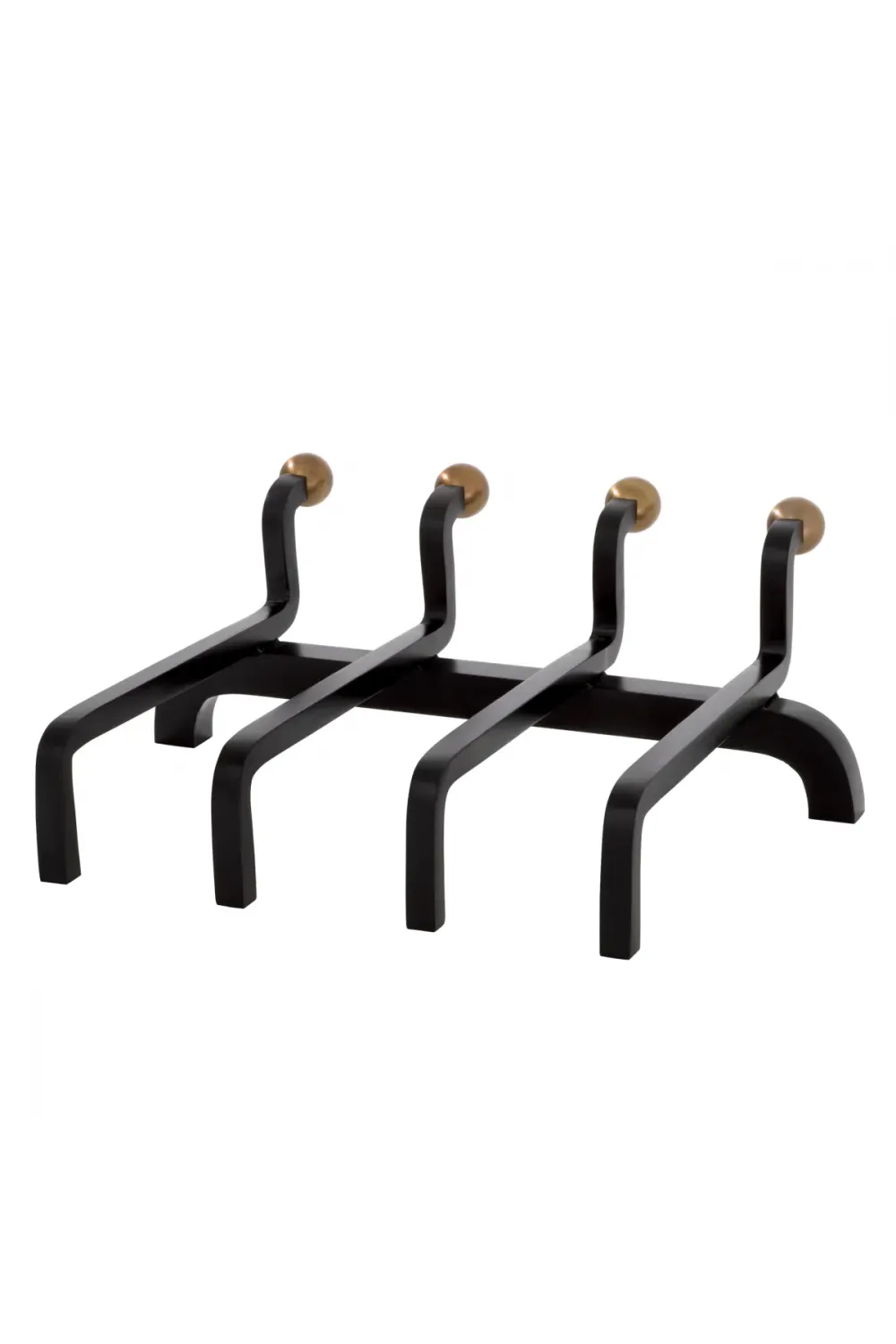 The piece is thoughtfully designed with upright front bars that keep logs securely in place, preventing them from rolling outward. Enhanced with elegant vintage brass finials, this luxury black and vintage brass finish fireplace tool introduces a refined decorative accent that harmonizes beautifully with both contemporary and traditional interiors. The contrast of black metal and warm brass detailing gives it a sculptural presence that elevates the visual appeal of any fireplace setting.