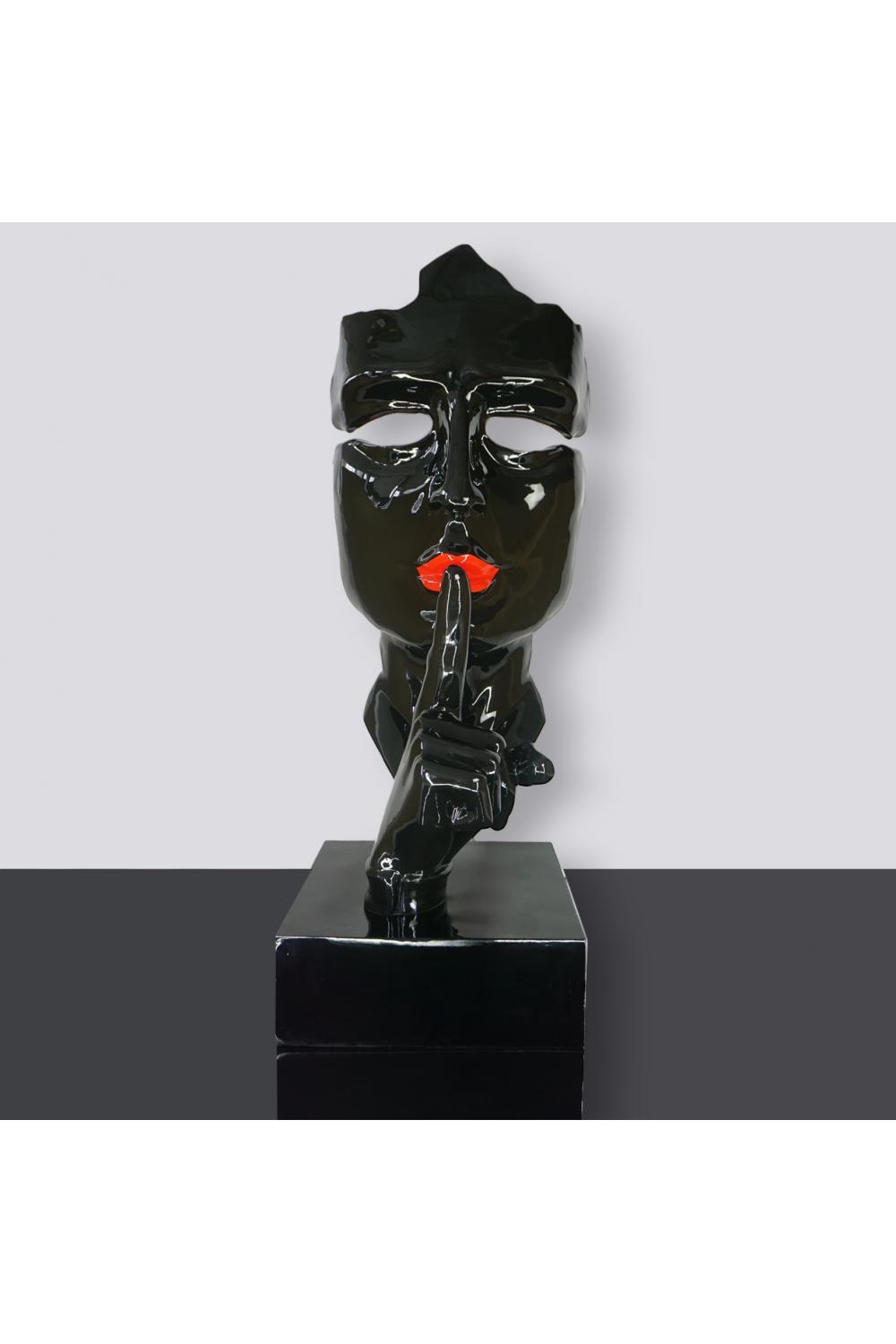 The Mask of Silence Sculpture is a captivating blend of symbolism and modern artistry. Crafted from premium PWS glass-fiber laminate, this large 190 cm figure depicts a serene black face with a raised hand, finger pressed gently to the lips — a gesture of silence and introspection. The glossy black finish and vivid red lips create a powerful contrast, turning the piece into a striking embodiment of elegance and depth.