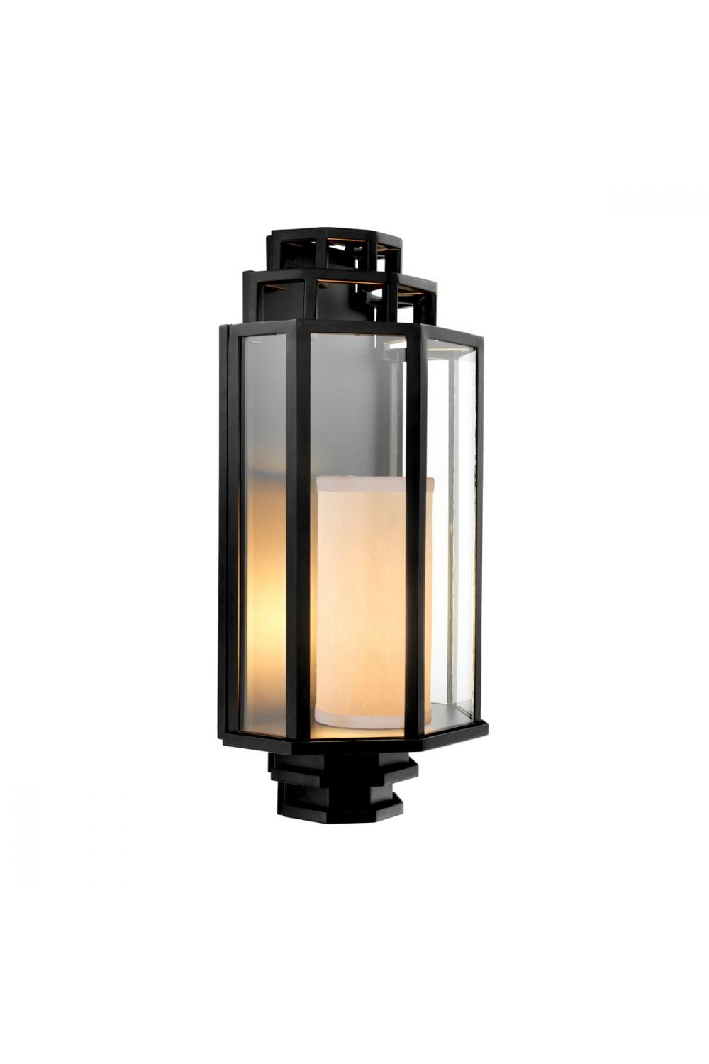 Luxury wall lamp with a striking architectural silhouette, defined by a sculpted frame and luminous inner glow. This refined black finish wall lamp blends clear glass panels with a soft cream shade for timeless elegance.