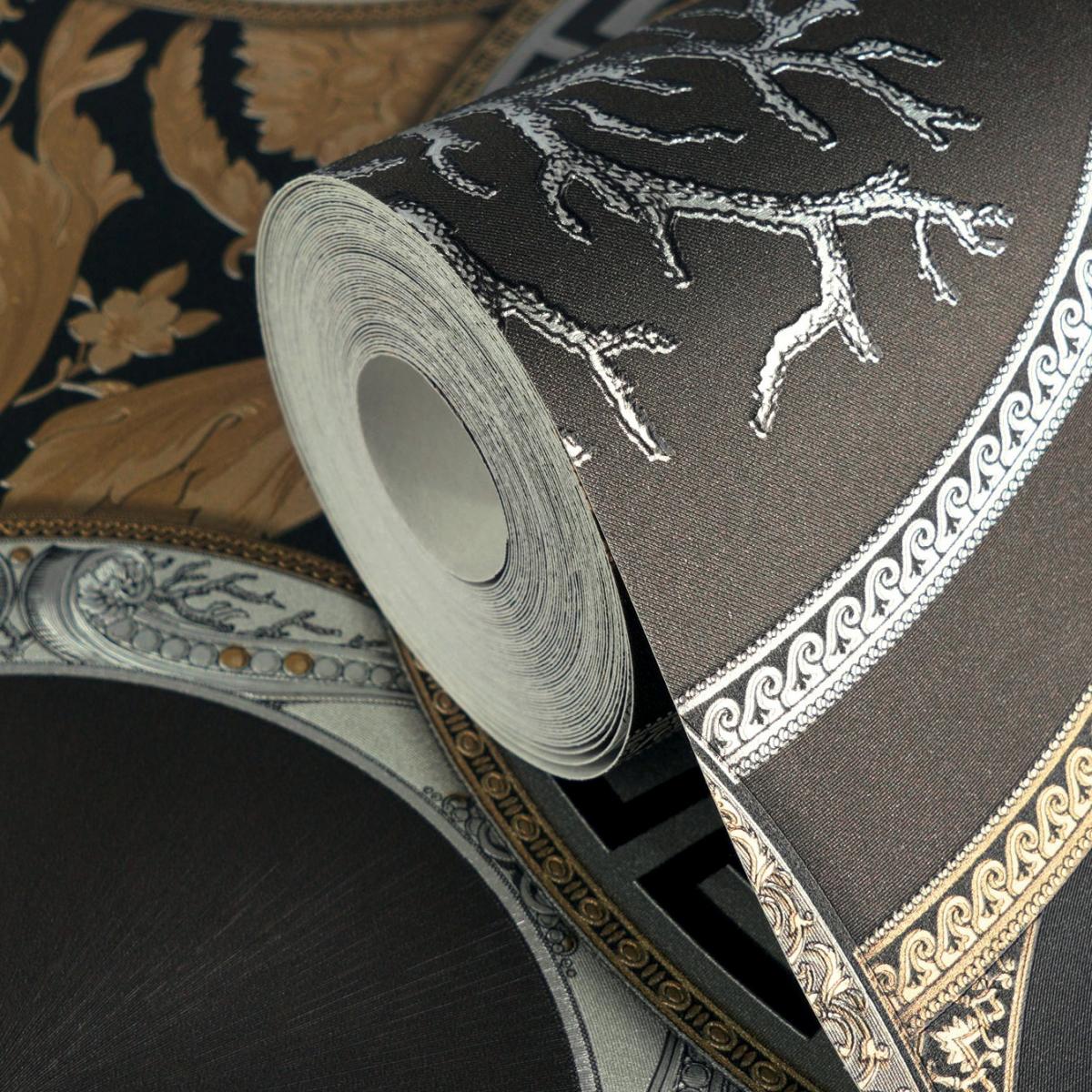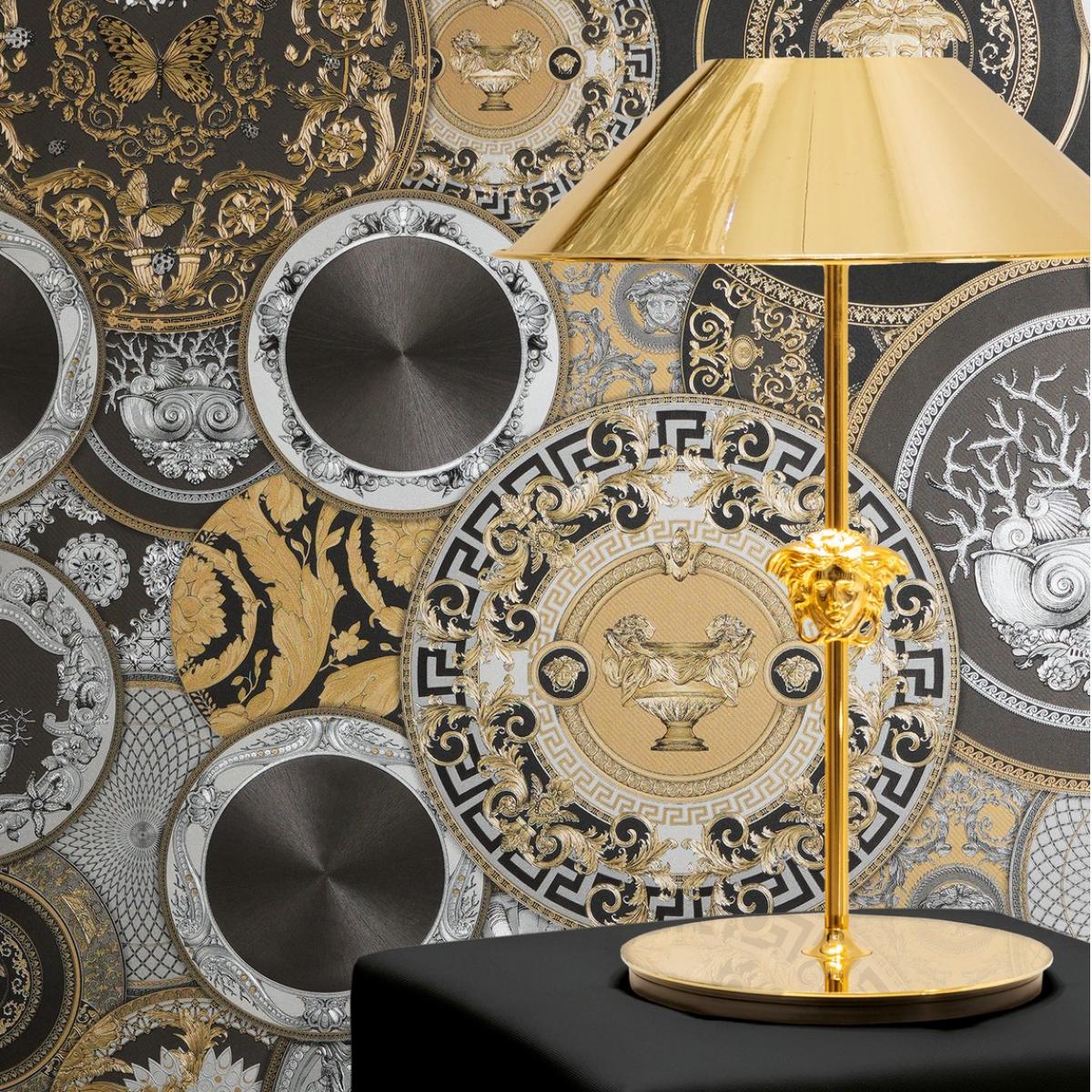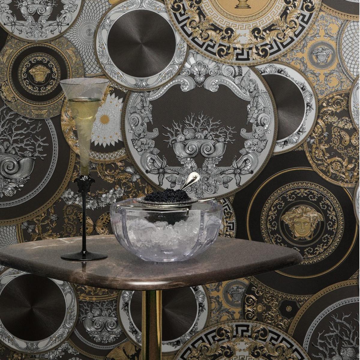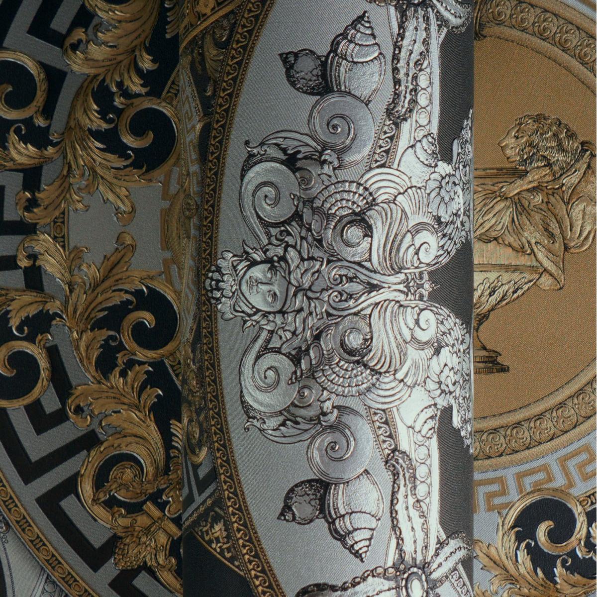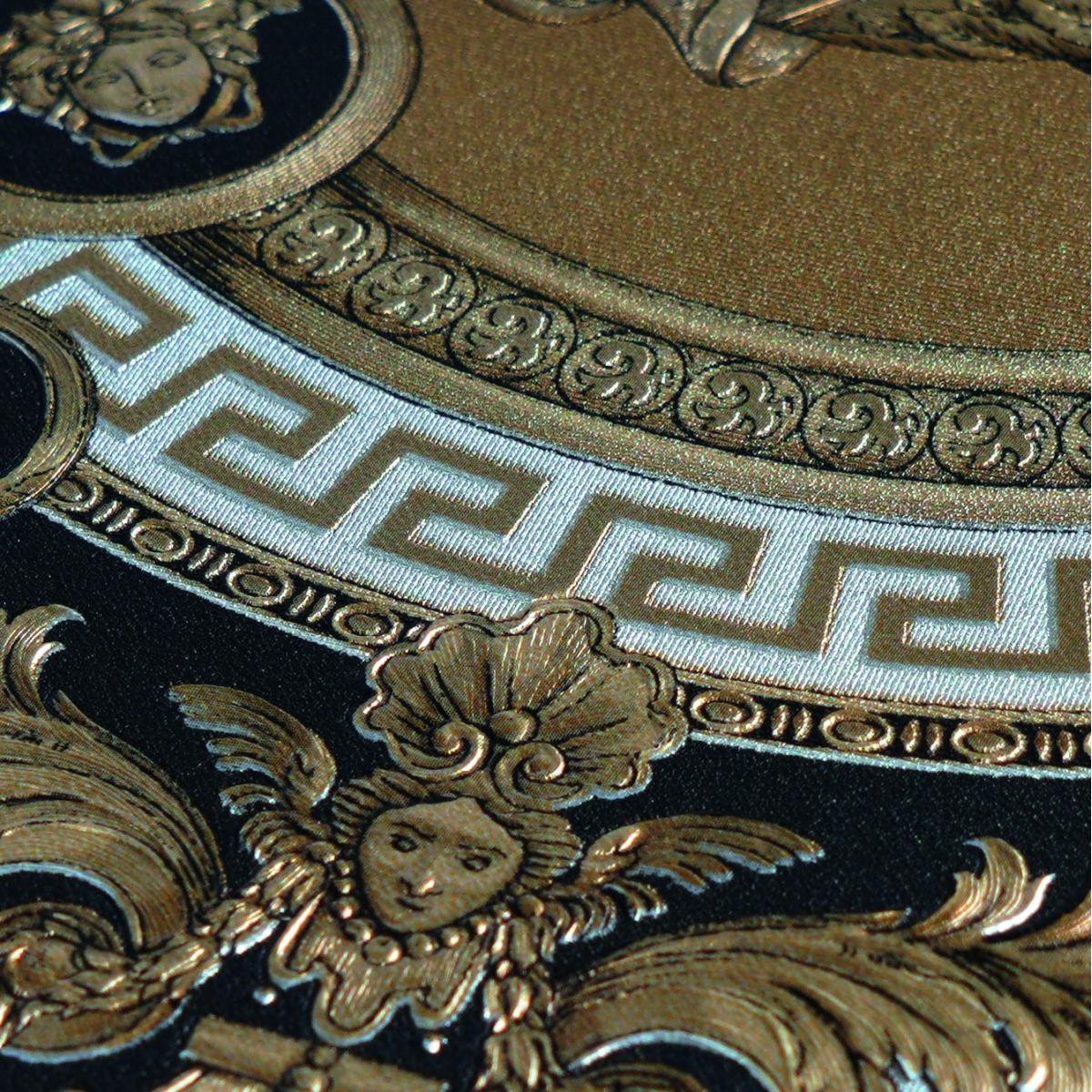 Luxury Baroque non-woven Versace wallpaper with artistic round ornaments, shiny, lightly textured - black, gold, silver. This elegant luxury wallpaper features intricate Medusa medallions, classical scrollwork, and metallic accents. Crafted as a premium non-woven wallpaper, it creates a bold statement wall with timeless European Baroque sophistication.