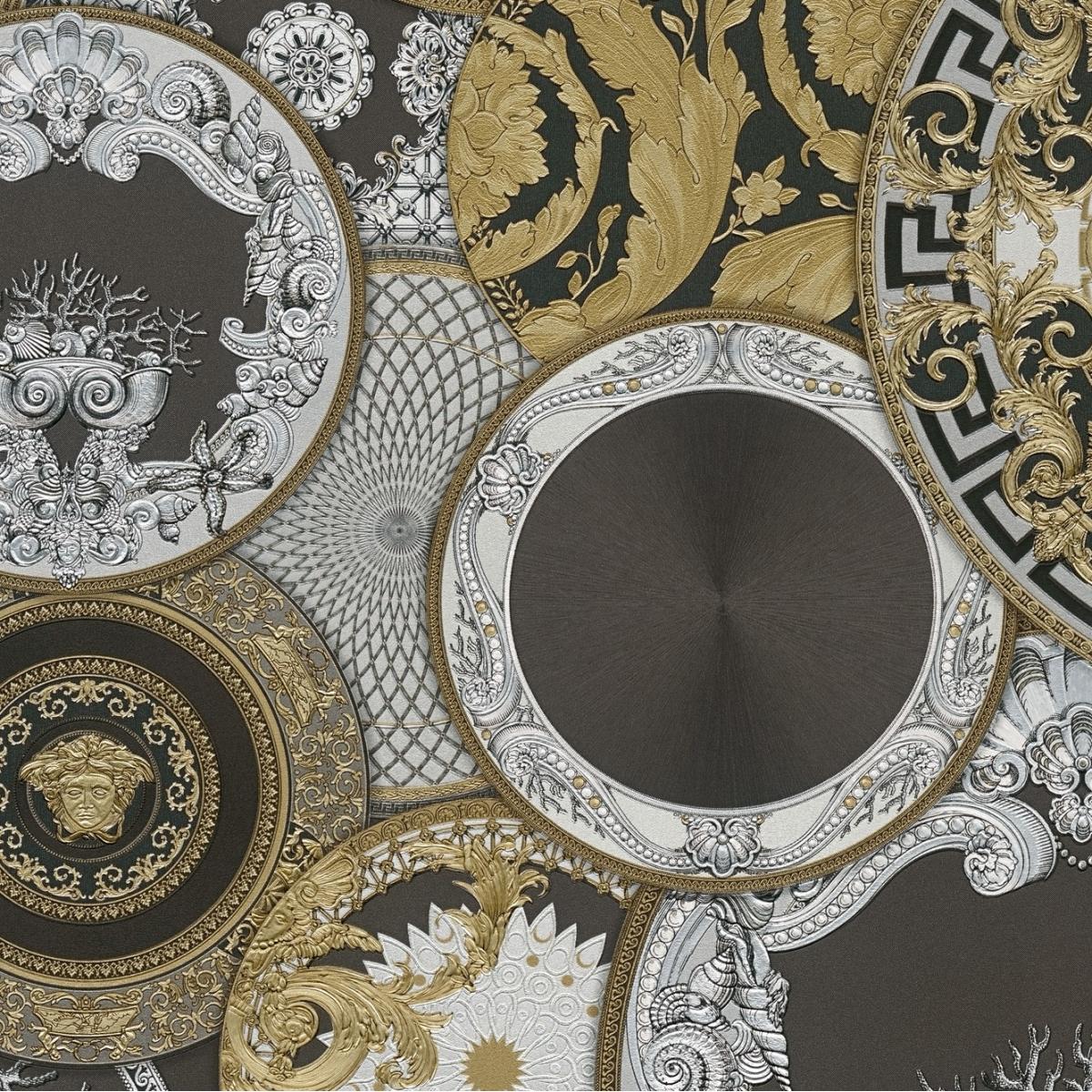 The Luxury Black Gold Baroque Non-Woven Designer Versace Wallpaper with Artistic Round Ornaments captures the dramatic elegance of European palace interiors where ornamental craftsmanship and architectural beauty meet. This luxury Baroque non-woven wallpaper with artistic round ornaments, shiny, lightly textured - black, gold, silver showcases an extraordinary decorative collage of classical medallions inspired by historical Italian decorative plates. Each circular ornament is framed with baroque acanthus scrollwork, intricate Greek key borders, and sculptural motifs including shells, botanical engravings, and classical Medusa elements. The striking contrast of deep black backgrounds with antique gold detailing and silver engraving highlights creates a rich visual depth, while the glossy metallic accents enhance the luxurious atmosphere. Crafted on a durable non-woven base with an embossed vinyl surface, the wallpaper offers both decorative sophistication and practical durability.