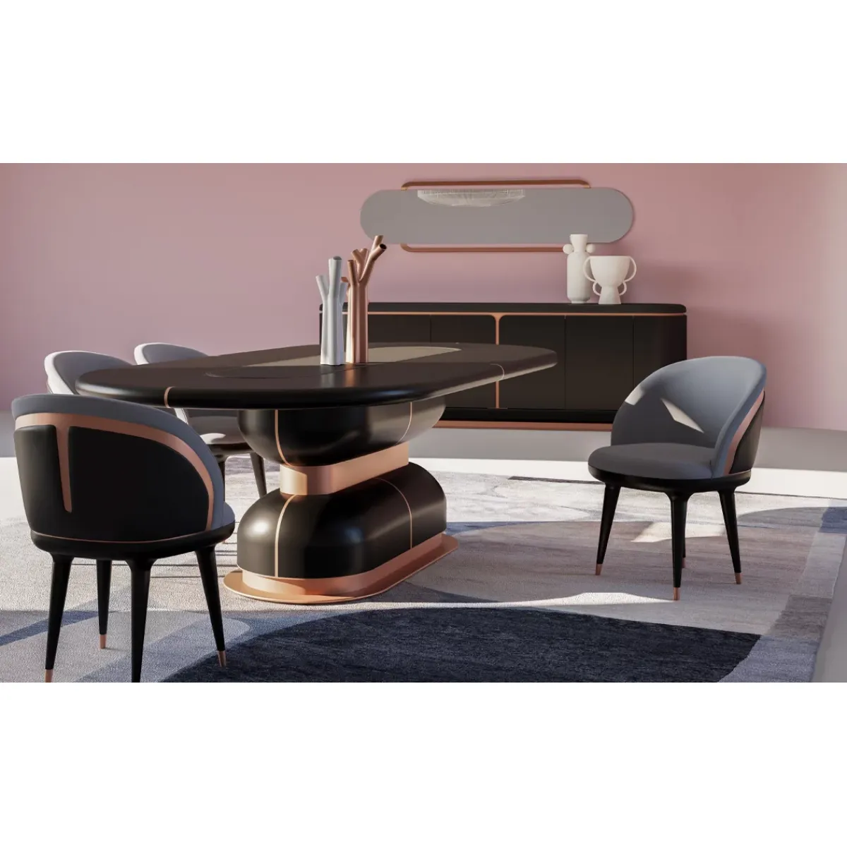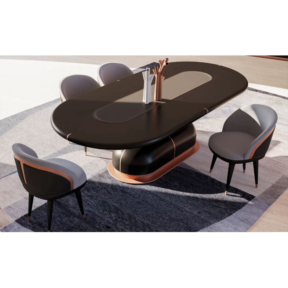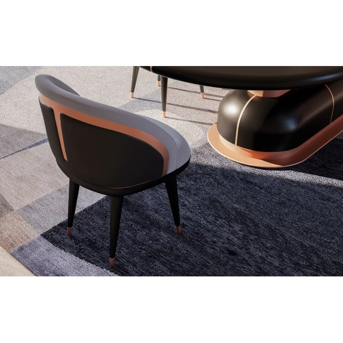 The title reflects the core identity of the piece—black and grey upholstery, modern design, and a distinctive copper finish design—each element contributing to its sophisticated appeal. As a luxury dining chair, it is ideal for refined dining rooms, modern apartments, and boutique hospitality environments. The neutral yet bold palette ensures versatility, allowing seamless pairing with marble, wood, or glass dining tables, making it a standout choice for curated interiors.