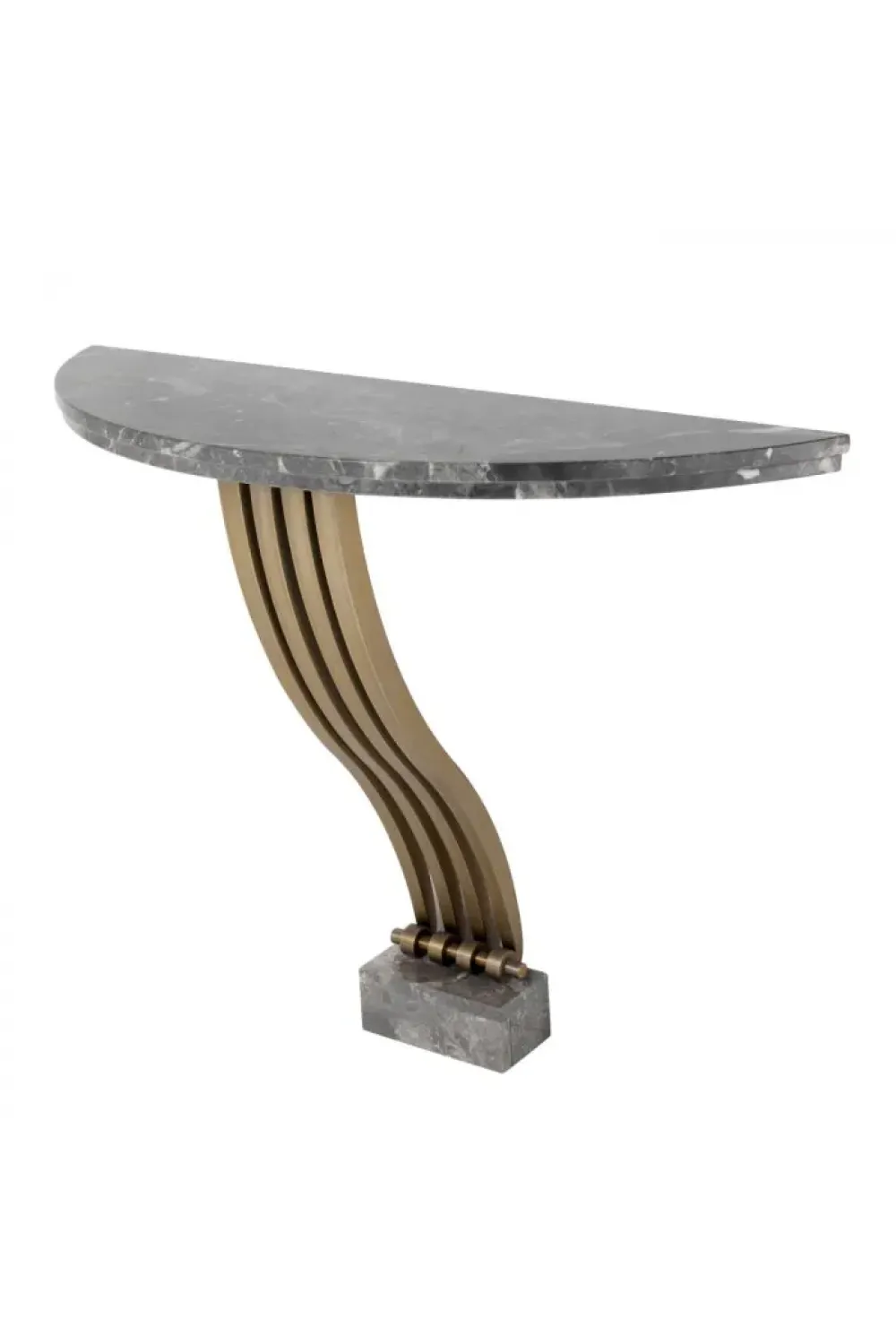 This luxury black marble semi-circular console table top with Brushed brass finish legs creates a confident focal point in refined interiors. The natural marble surface showcases rich veining and tonal depth. Gracefully curved brass legs add classical movement and balance. Ideal for hallways and living rooms. A timeless luxury console table with architectural presence.