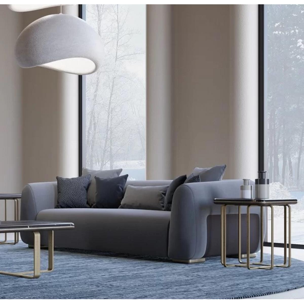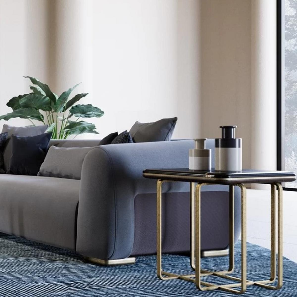 The open-frame construction is where the piece truly feels modern. Beige matte powder-coated metal forms a clean, structured base with vertical side posts and horizontal rails, creating a light, airy look from every angle. The stone top appears to rest directly on the upper frame rails, highlighting the intentional balance between solid support and a visually open design. As a brass frame side table option in tone and style, the frame’s warm, elegant presence brings an upscale finish to your room. Pair this piece effortlessly with the Luxury Modern Grey 3 Seater Sofa to create a cohesive living space defined by contemporary elegance and comfort.