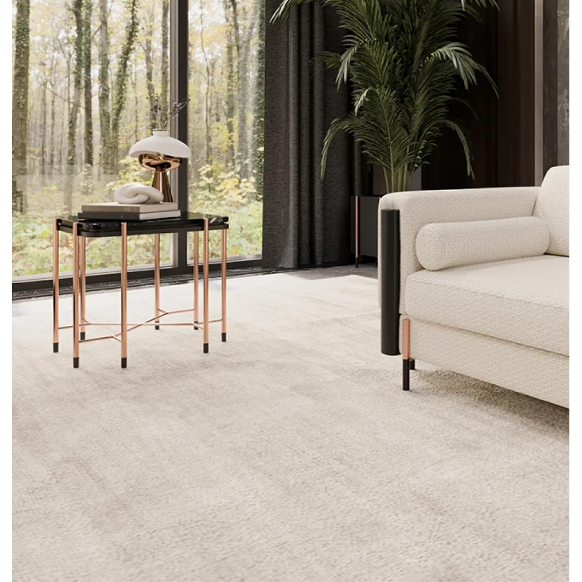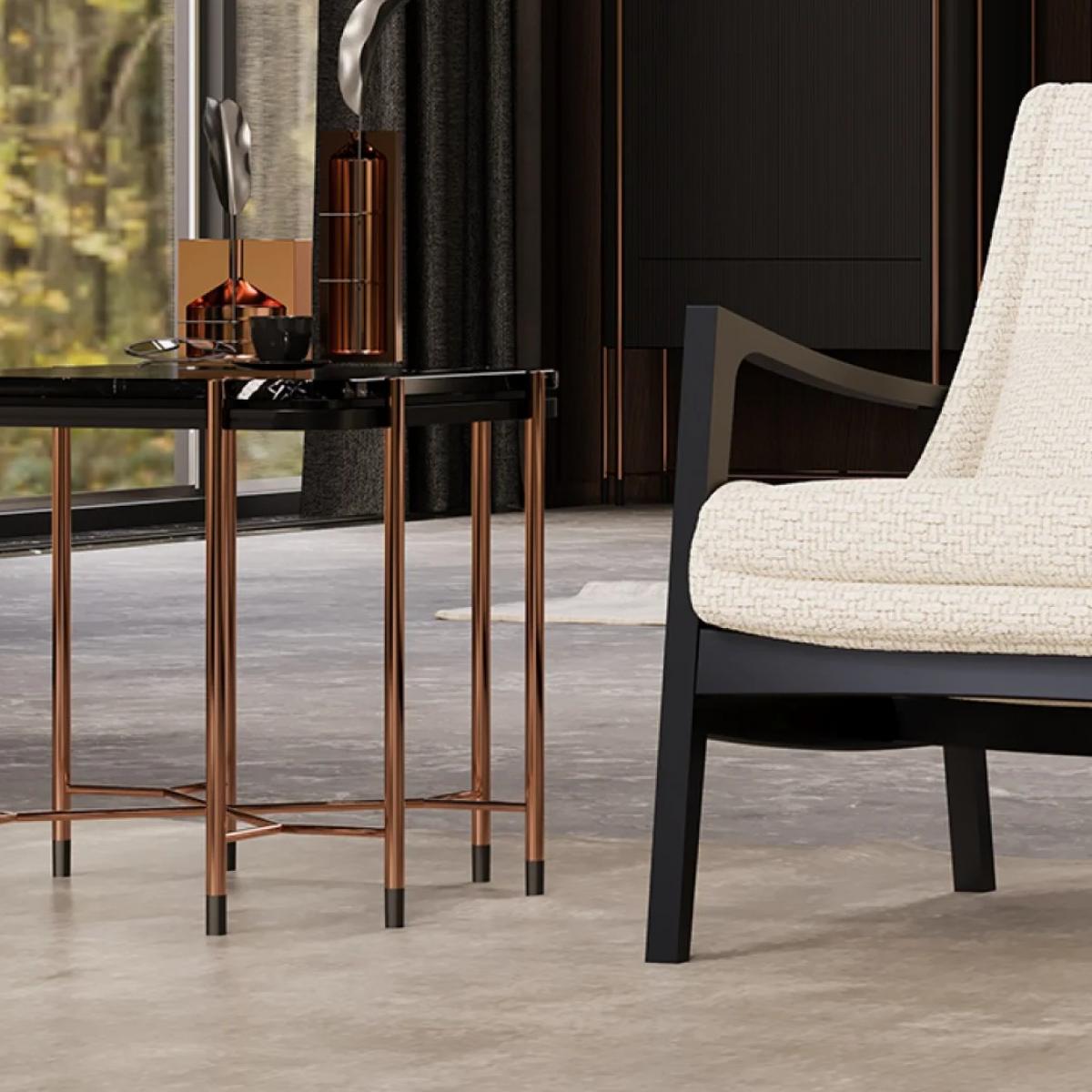 Built as a compact, medium-height surface, it works smoothly beside a sofa, next to an accent chair, or as an extra surface in a lounge corner. Four legs provide a balanced stance, with black foot caps at the base to help protect flooring and complete the streamlined appearance. Overall, the glossy finish on the tabletop and smooth leg finish create a polished contrast that pairs well with contemporary, modern, and minimal interiors—an side table with copper finish legs look that elevates your everyday setup. Discover refined designs in our luxury side table collection, perfect for adding elegance and functionality to sophisticated interiors.