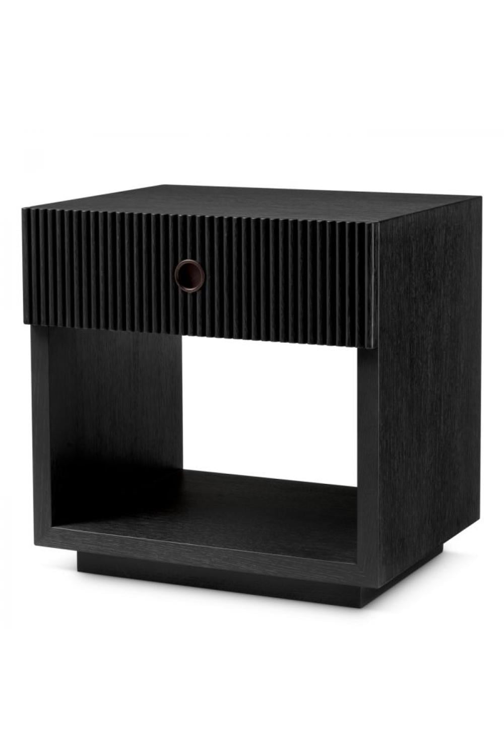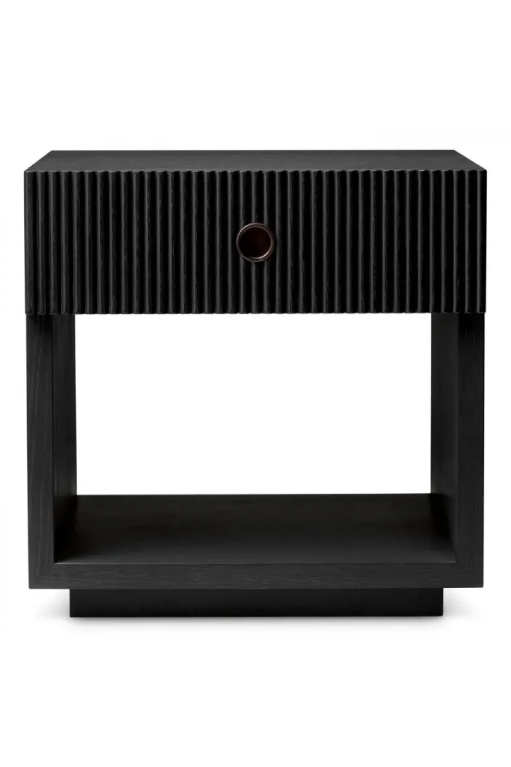 This luxury black nightstand features a striking charcoal oak veneer complemented by ribbed wooden panels and a sophisticated bronze finish. Perfect for elevating your bedroom, it combines elegance and function in a sleek, modern design.