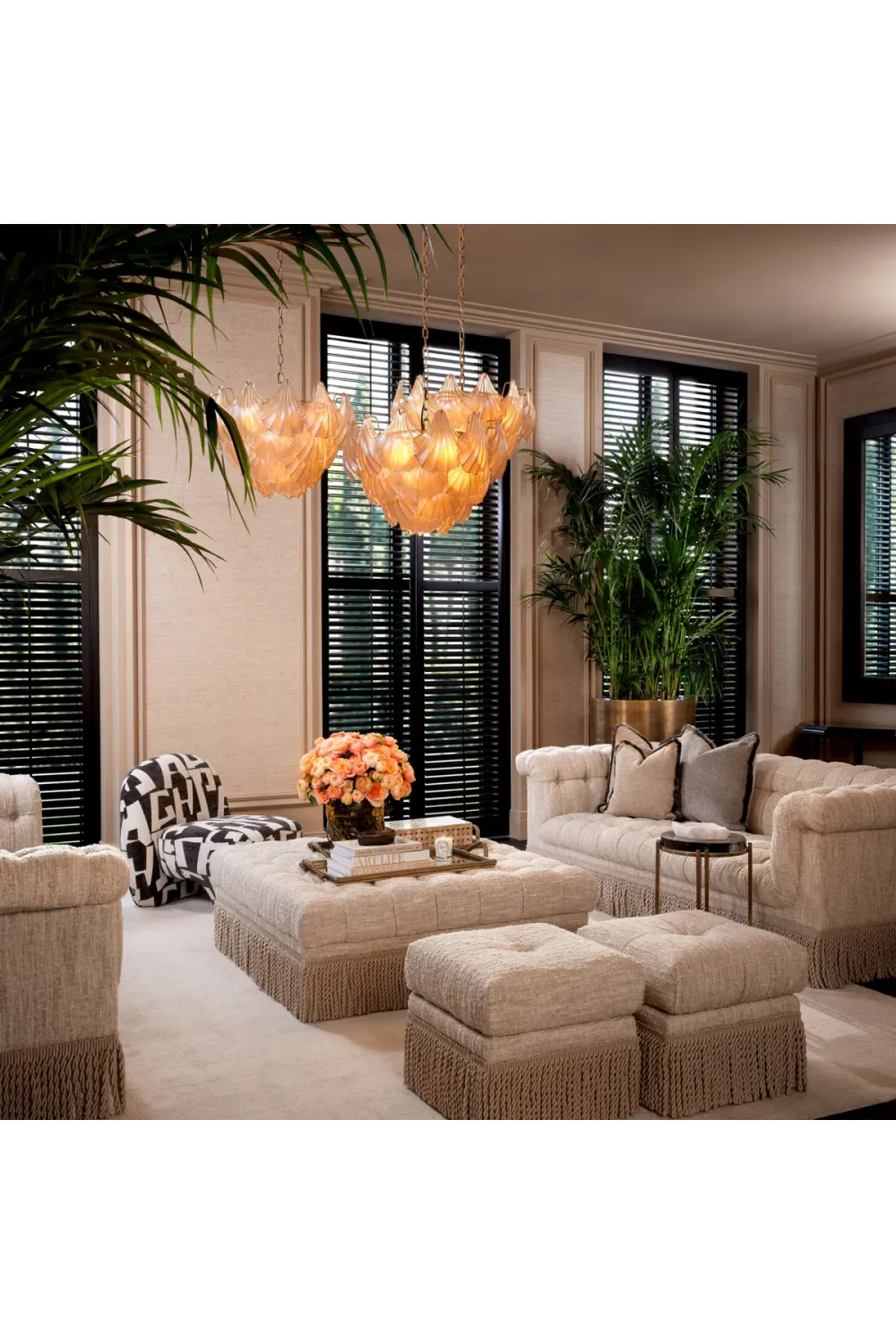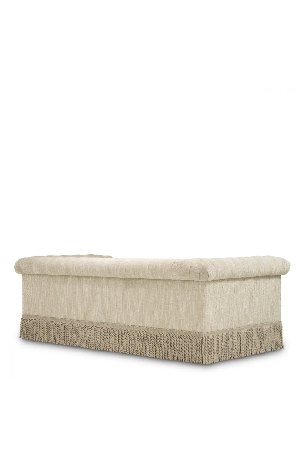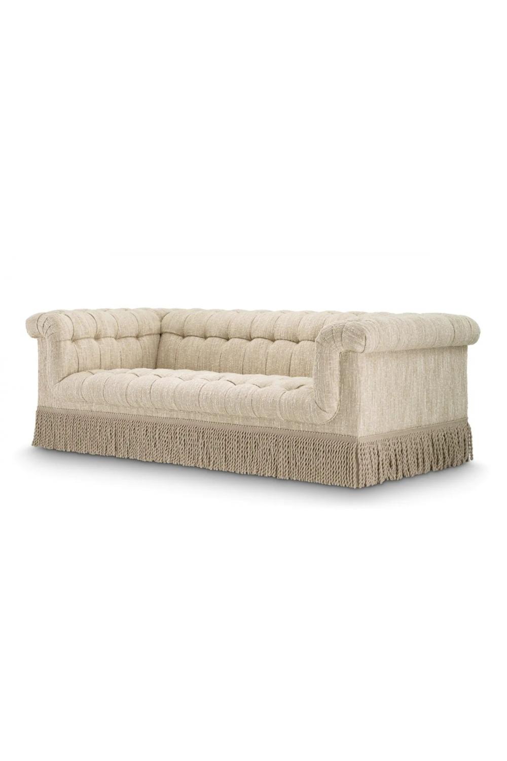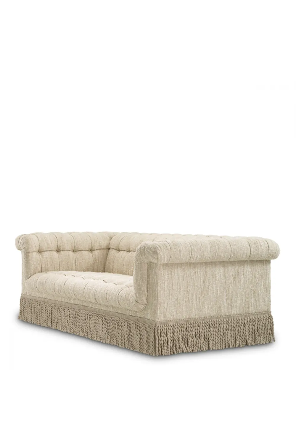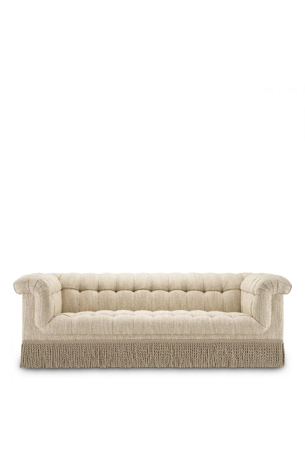 Its generous proportions invite indulgent comfort, while the sculpted silhouette is accentuated by deep tufting and graceful fringes that drape effortlessly along the base. This sofa with tufted design and elegant fringes reflects meticulous attention to detail—each element carefully composed to evoke understated opulence and lasting beauty.
