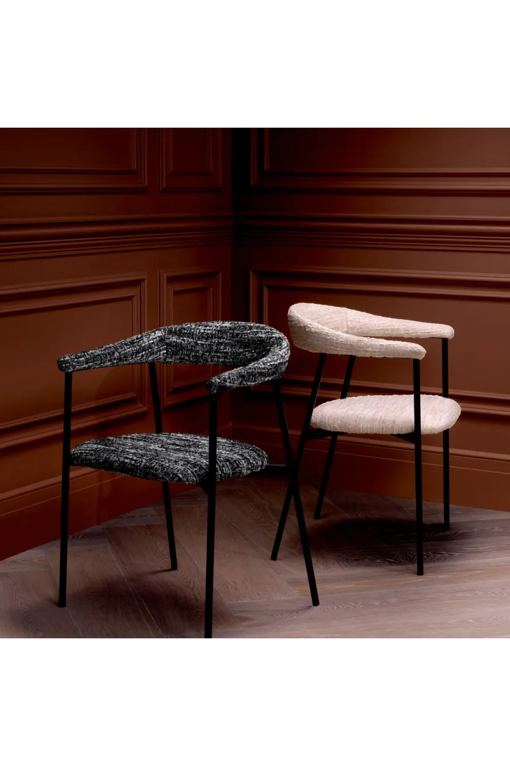 Bouclé sonata upholstered chair with graceful lines defines this luxury dining Chair as a statement of modern elegance. This luxury dining Chair introduces rich texture and subtle contrast into sophisticated dining interiors. Presented as a Dining Chair set of 2, it offers visual harmony and balanced seating arrangements. Designed with a dining chair with black metal legs, it ensures durability with a light architectural presence. Ideal for refined European homes, it blends comfort, craftsmanship, and timeless design.