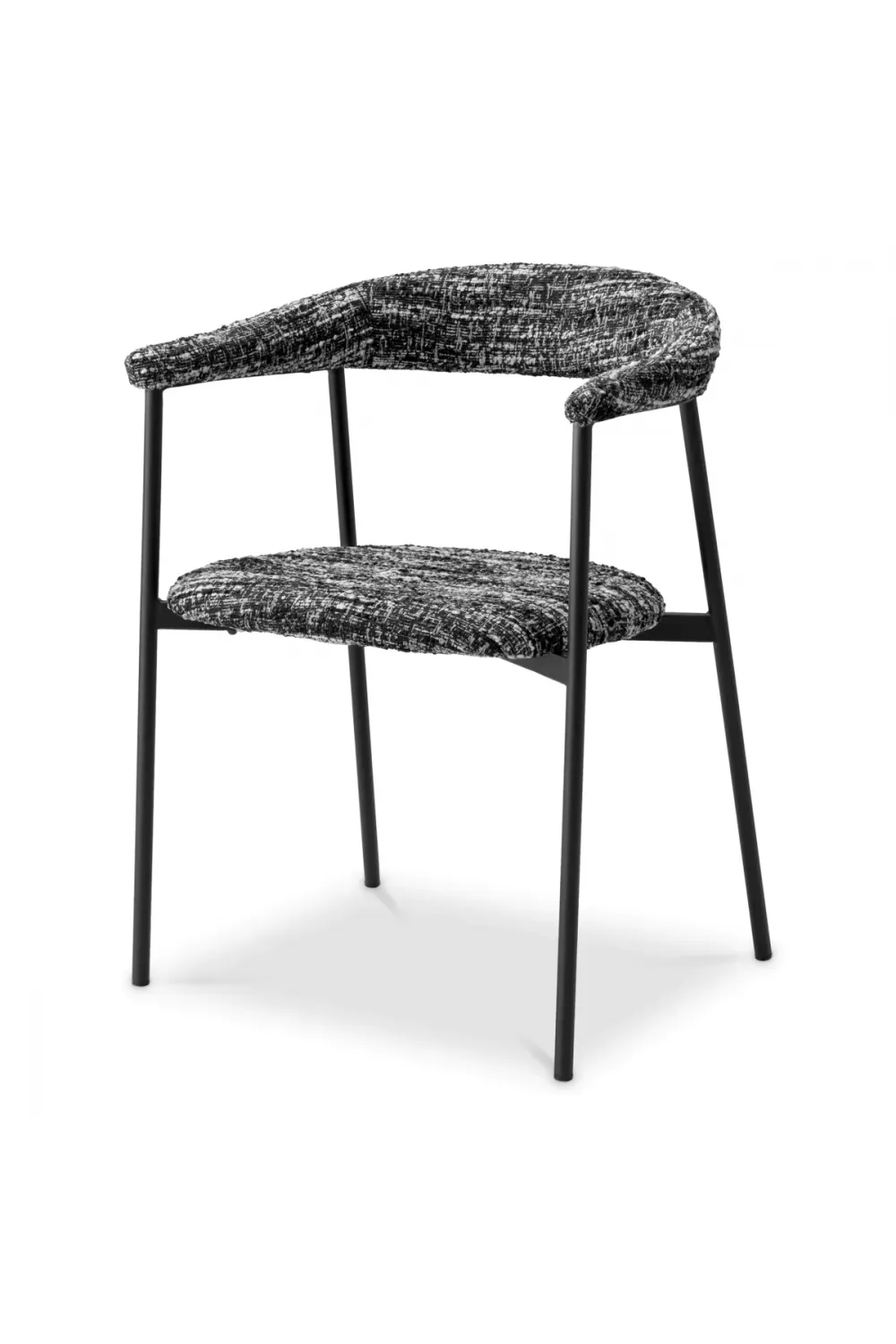 The structure is completed with slim black metal legs that provide stability while maintaining visual lightness. Designed as a dining chair with black metal legs, the frame introduces subtle contrast against the textured bouclé fabric, reinforcing the chair’s contemporary character. Ideal for elegant dining rooms, boutique apartments, and luxury European interiors, this luxury dining Chair set combines durability, comfort, and understated sophistication—making it a timeless addition to elevated dining spaces.