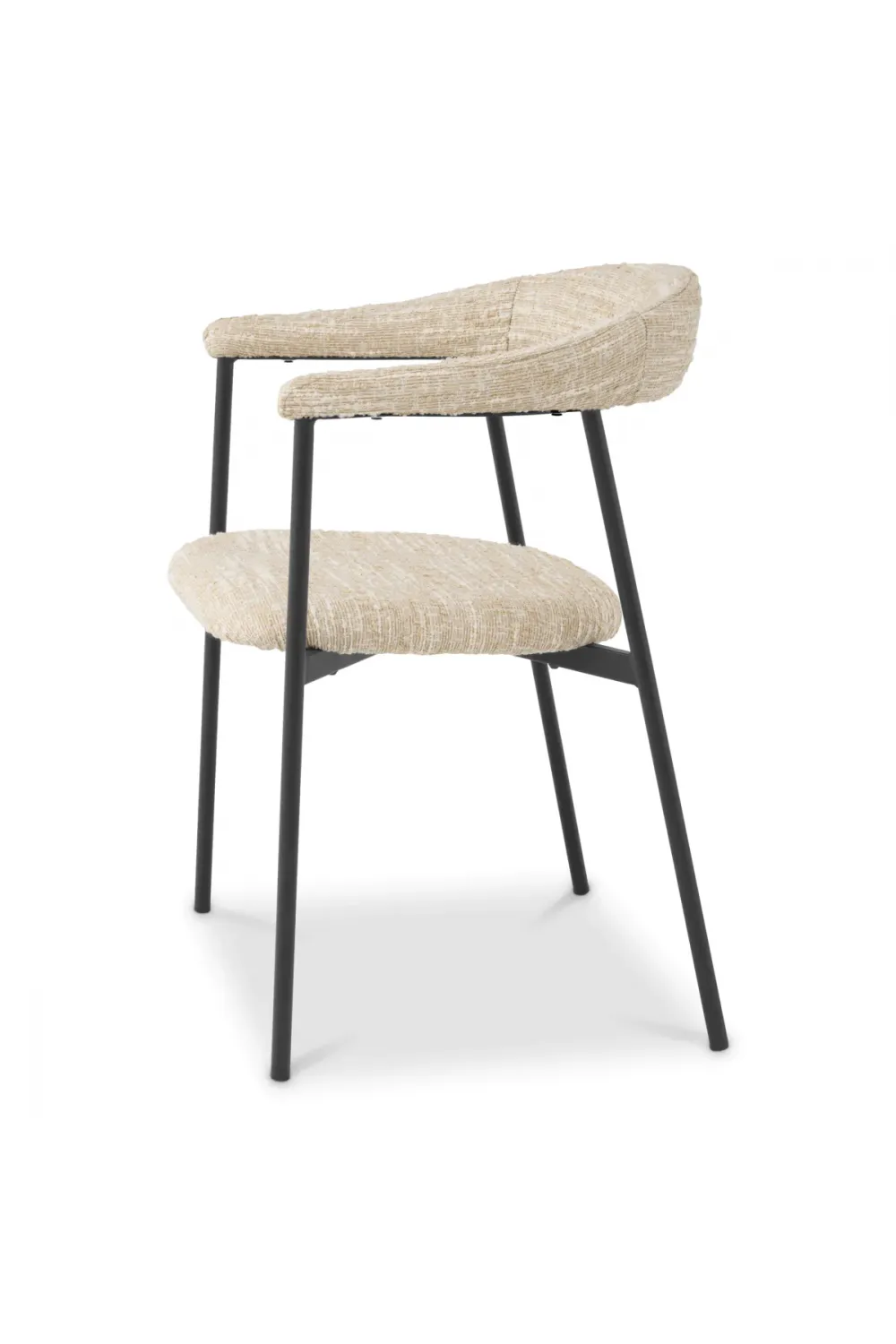 The structure is completed with slim black metal legs that provide stability while maintaining visual lightness. Designed as a dining chair with black metal legs, the frame introduces subtle contrast against the textured bouclé fabric, reinforcing the chair’s contemporary character. Ideal for elegant dining rooms, boutique apartments, and luxury European interiors, this luxury dining Chair set combines durability, comfort, and understated sophistication—making it a timeless addition to elevated dining spaces.