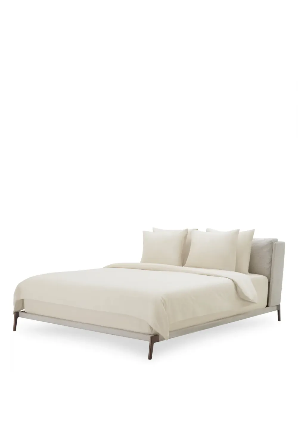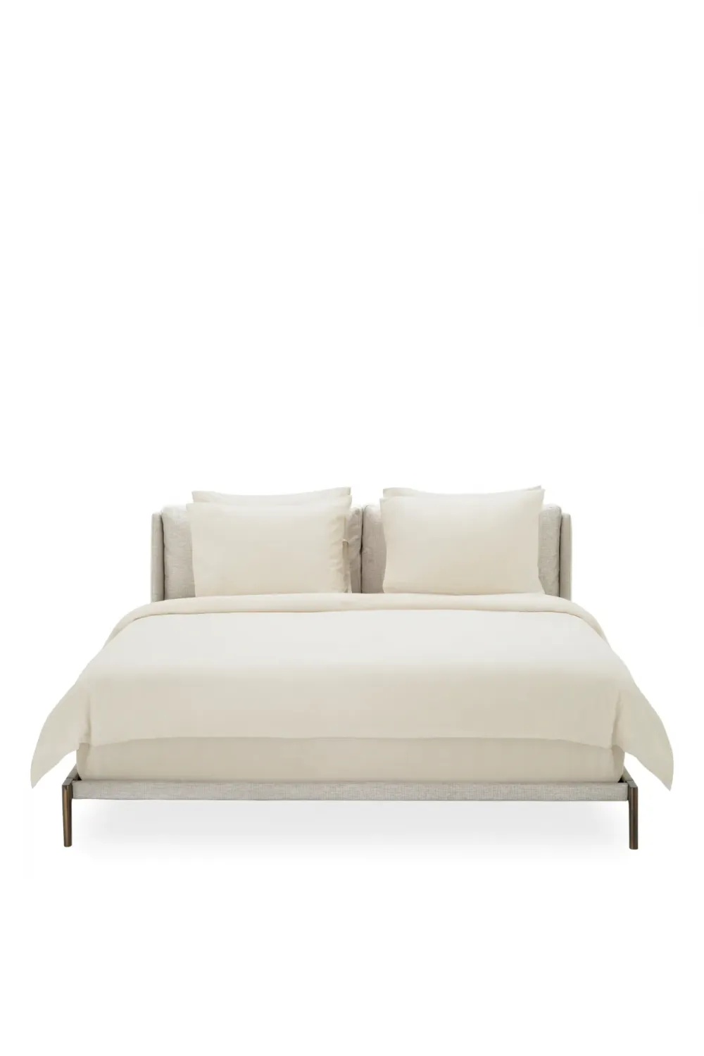 The refined structure is elevated by a bronze finish, bringing a modern yet timeless metallic accent that enhances the architectural lines of the design. This harmonious balance between fabric warmth and metallic sophistication creates a visually striking luxury bed that complements both minimalist and classic bedroom settings.