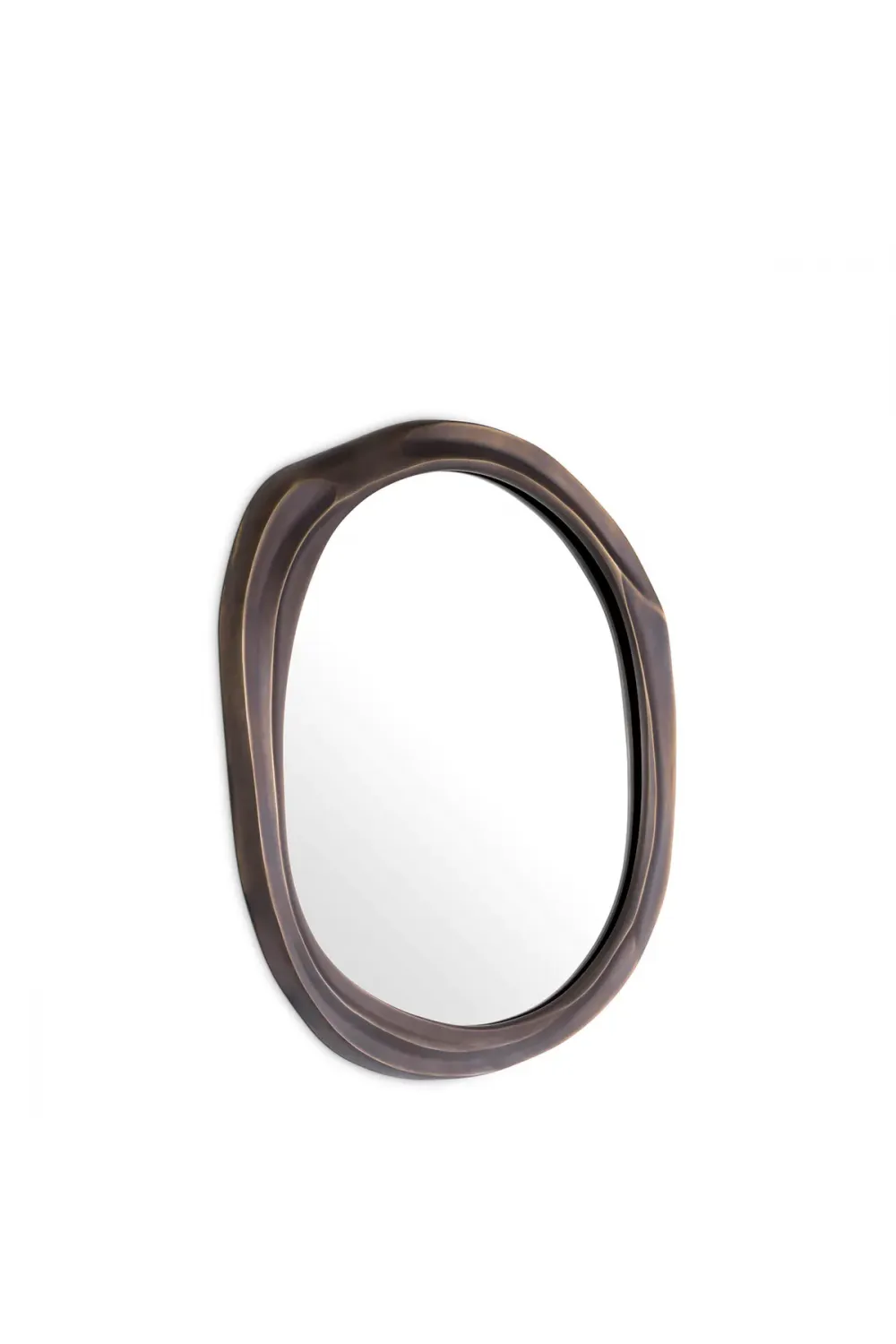 Crafted with precision, the mirror features a richly layered surface finished in warm bronze tones with subtle brass influences. The signature oval mirror shape creates harmony and balance, giving the design a versatile appeal suitable for classical and contemporary décor themes. The textured edges add depth and character, while the bronze finish mirror treatment highlights warm reflections, enhancing ambient lighting. Every element of this piece reflects quality craftsmanship, making it stand out as both a functional accessory and a sculptural décor object.