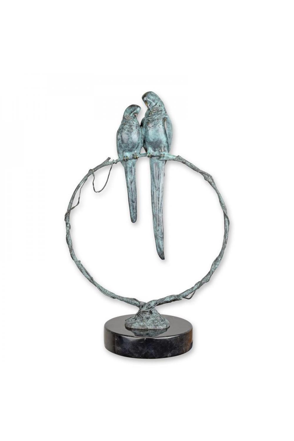 Rising with sculptural grace, this dual-parrot composition captures a moment of quiet dialogue between the two birds. Their feather patterns, expressive posture, and gentle inclination toward one another reveal exquisite craftsmanship. The branching support, shaped with organic twists and knots, anchors the scene and heightens the naturalistic feel. Bronze tones shift subtly across the birds’ layered plumage, enhancing the complexity expected from a masterfully cast bronze sculpture statue.