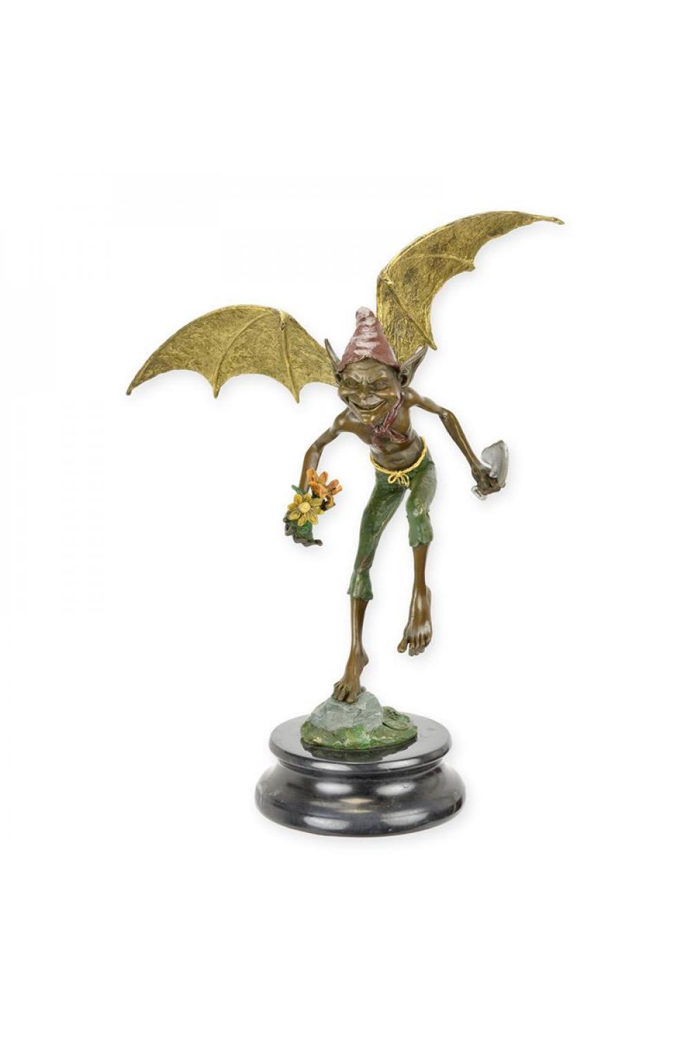 This exceptional bronze sculpture features a winged goblin, blending elements of fantasy and classical metalwork into a captivating decorative piece. Standing 34 cm tall, it showcases intricate sculptural details—from the textured wings to the expressive posture—highlighted by a warm antique bronze patina. Created using traditional casting techniques, the figurine brings depth, character, and artisanal charm to any interior display.