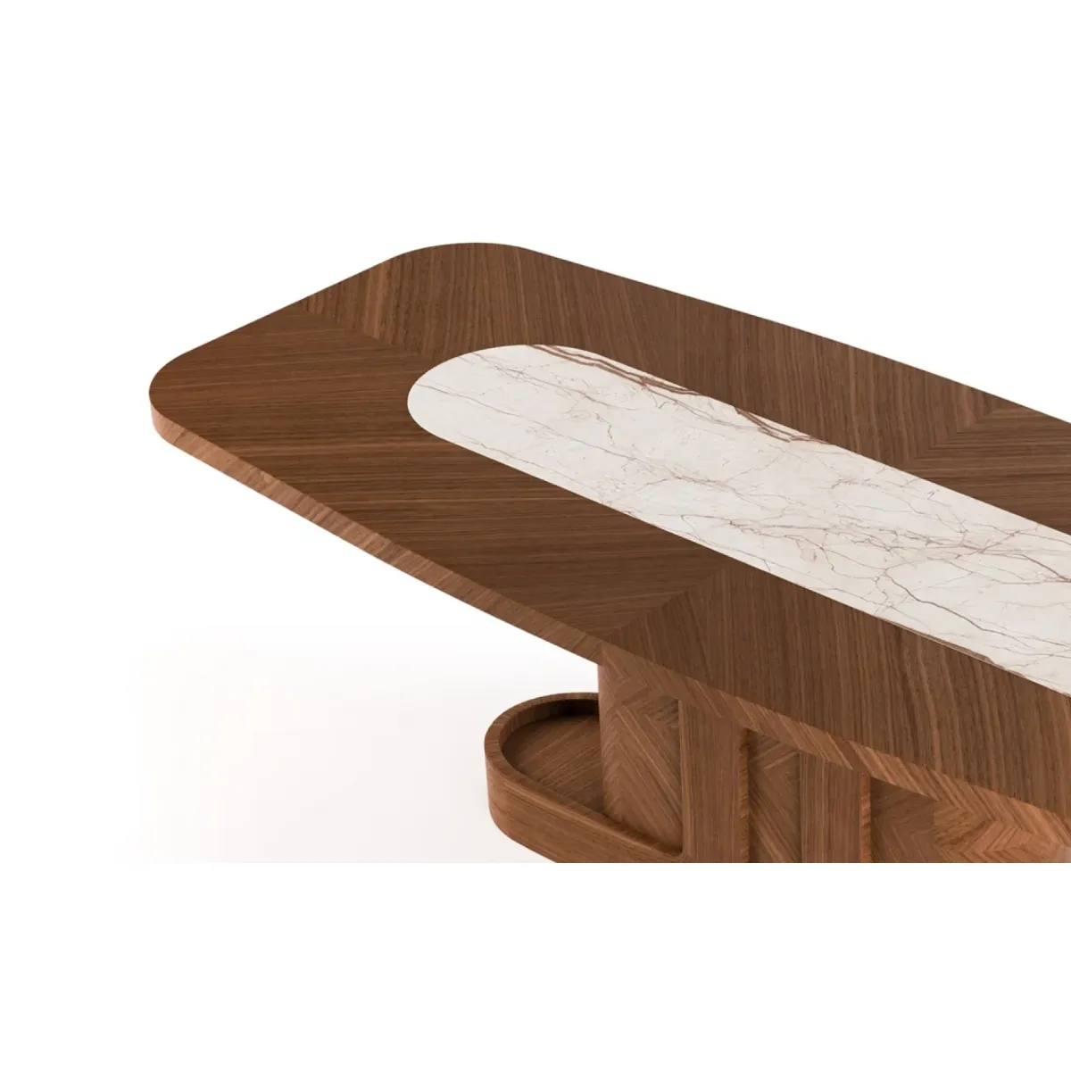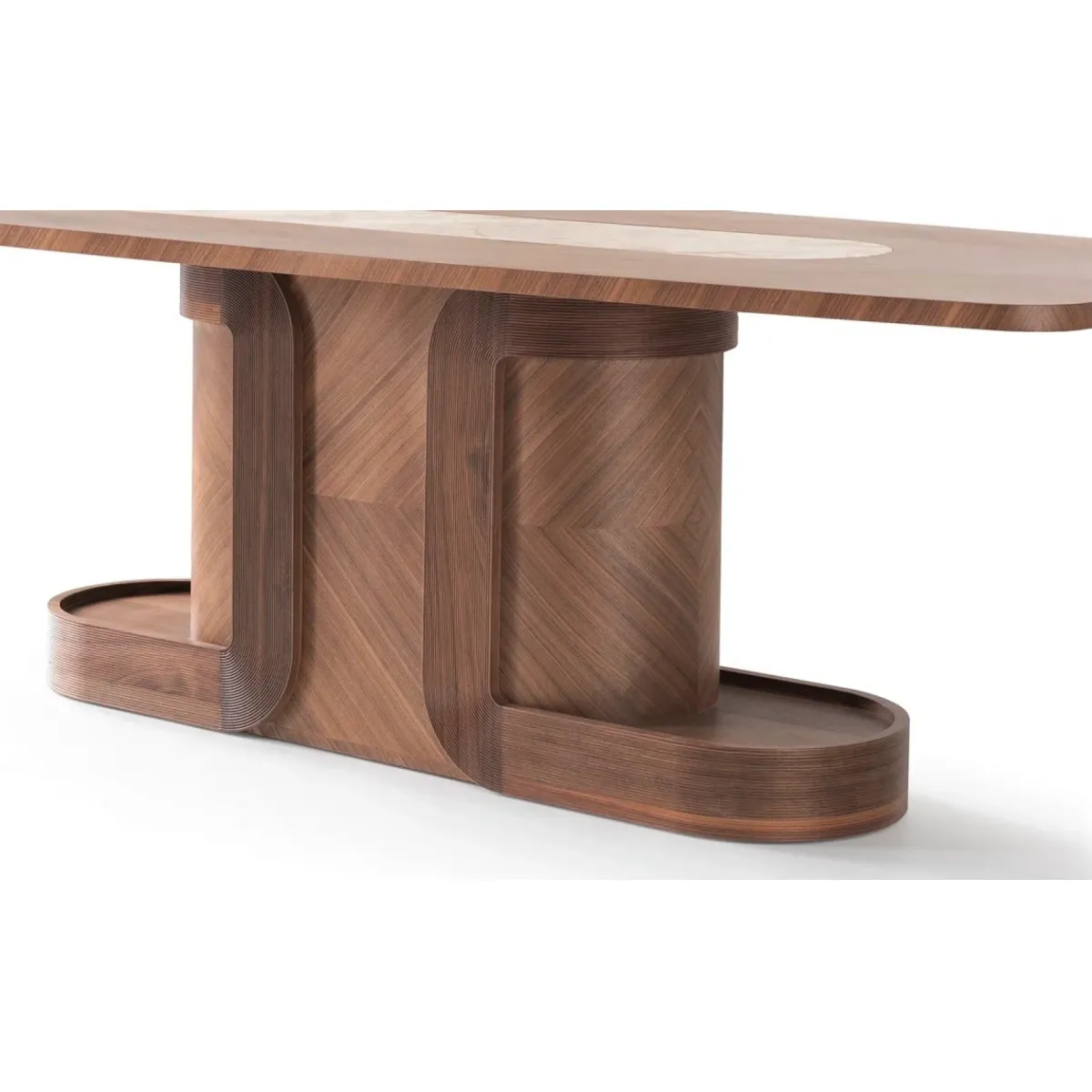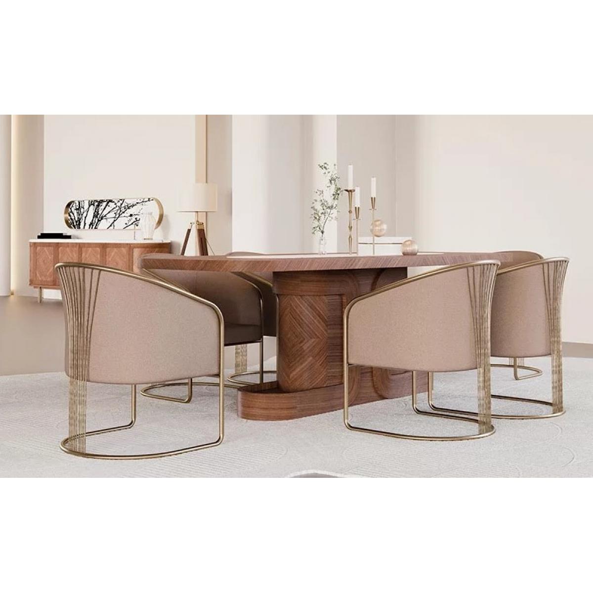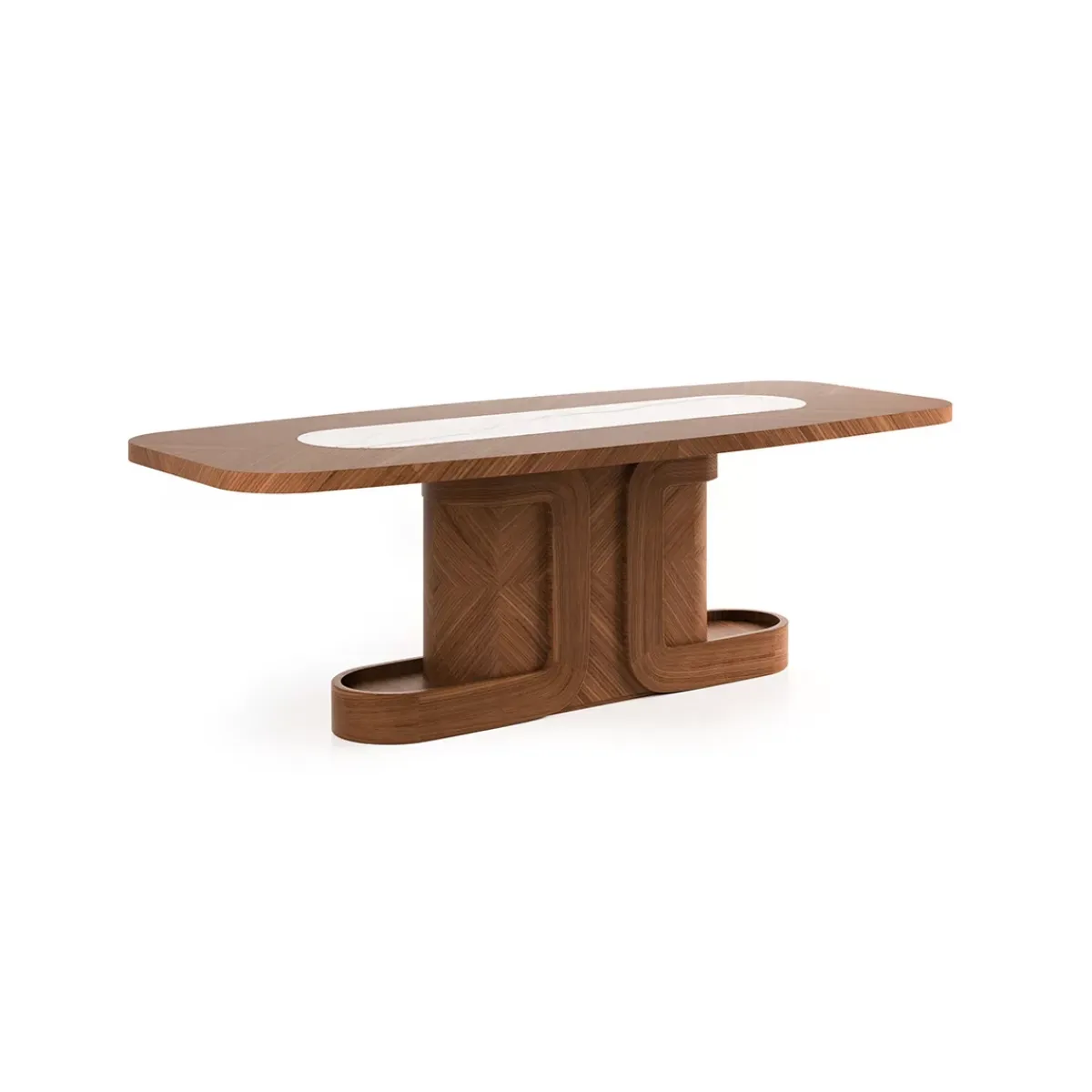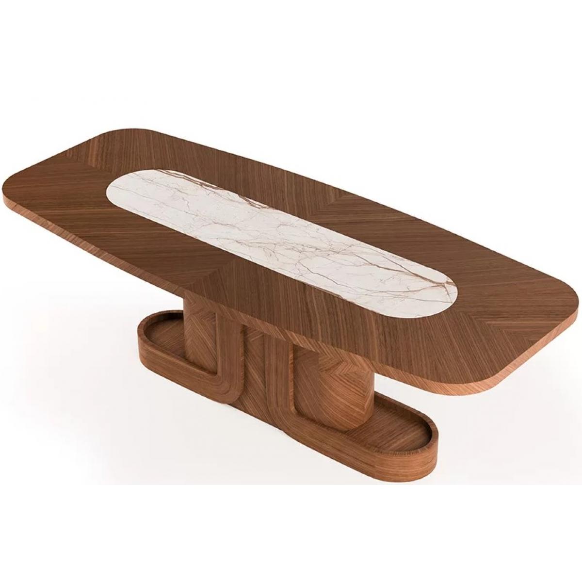 Luxury brown rectangular top centre white marble inlay modern pedestal wooden dining table designed for modern luxury interiors. This luxury dining table features a sleek wooden base with an elegant marble inlay, creating a stunning centerpiece for refined dining spaces.