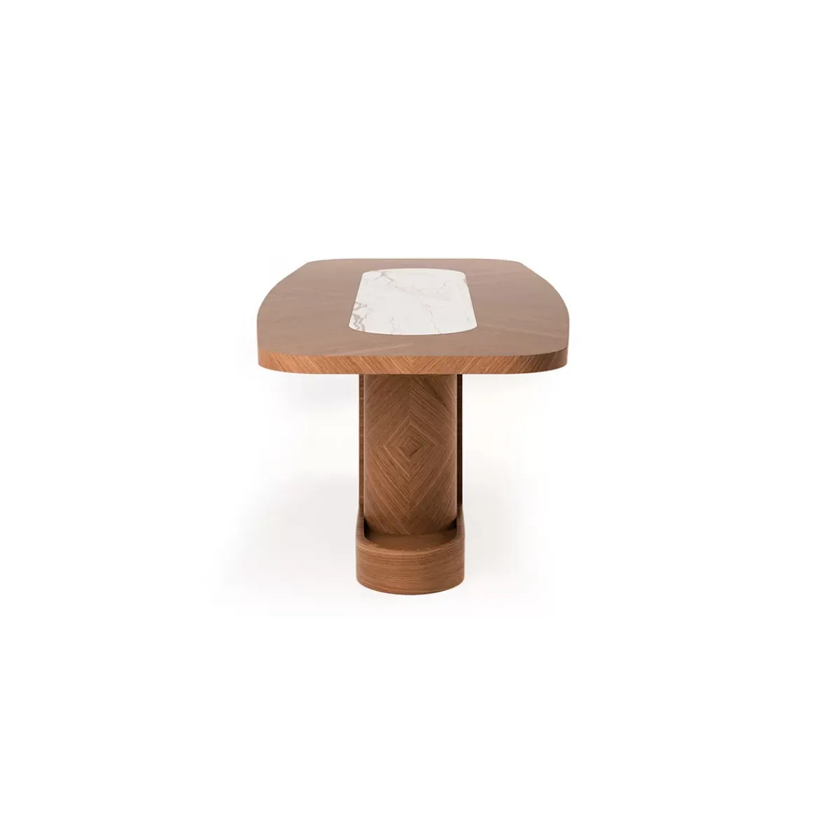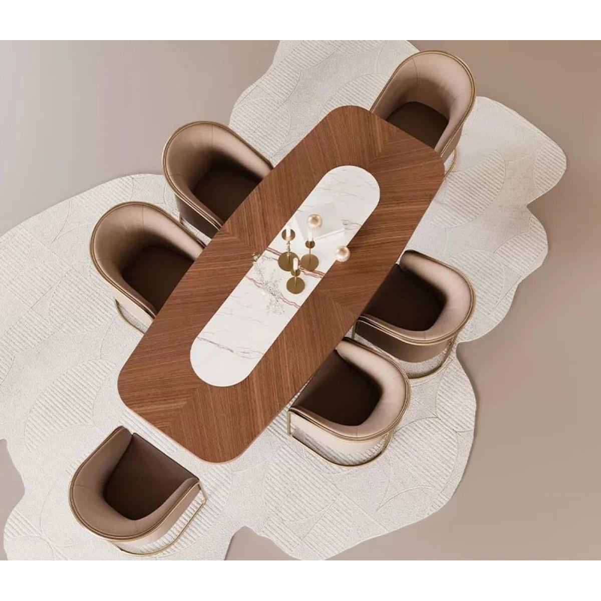 • Luxury brown rectangular top centre white marble inlay modern pedestal wooden dining table combining warm wooden elegance with premium marble craftsmanship.