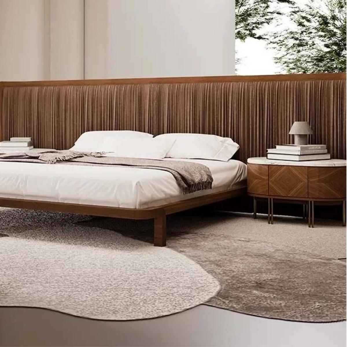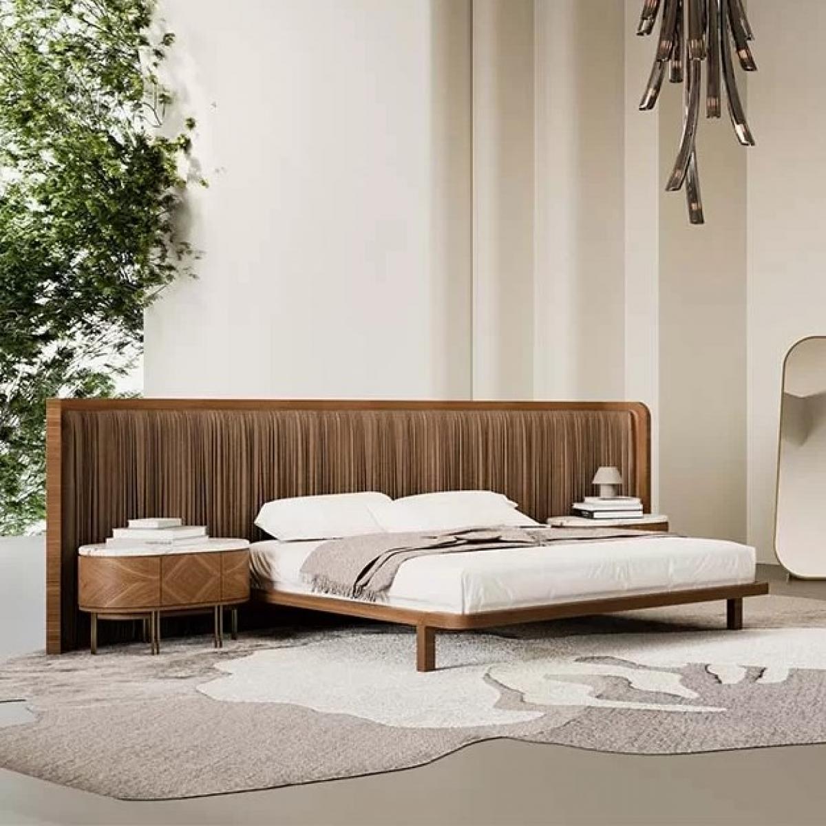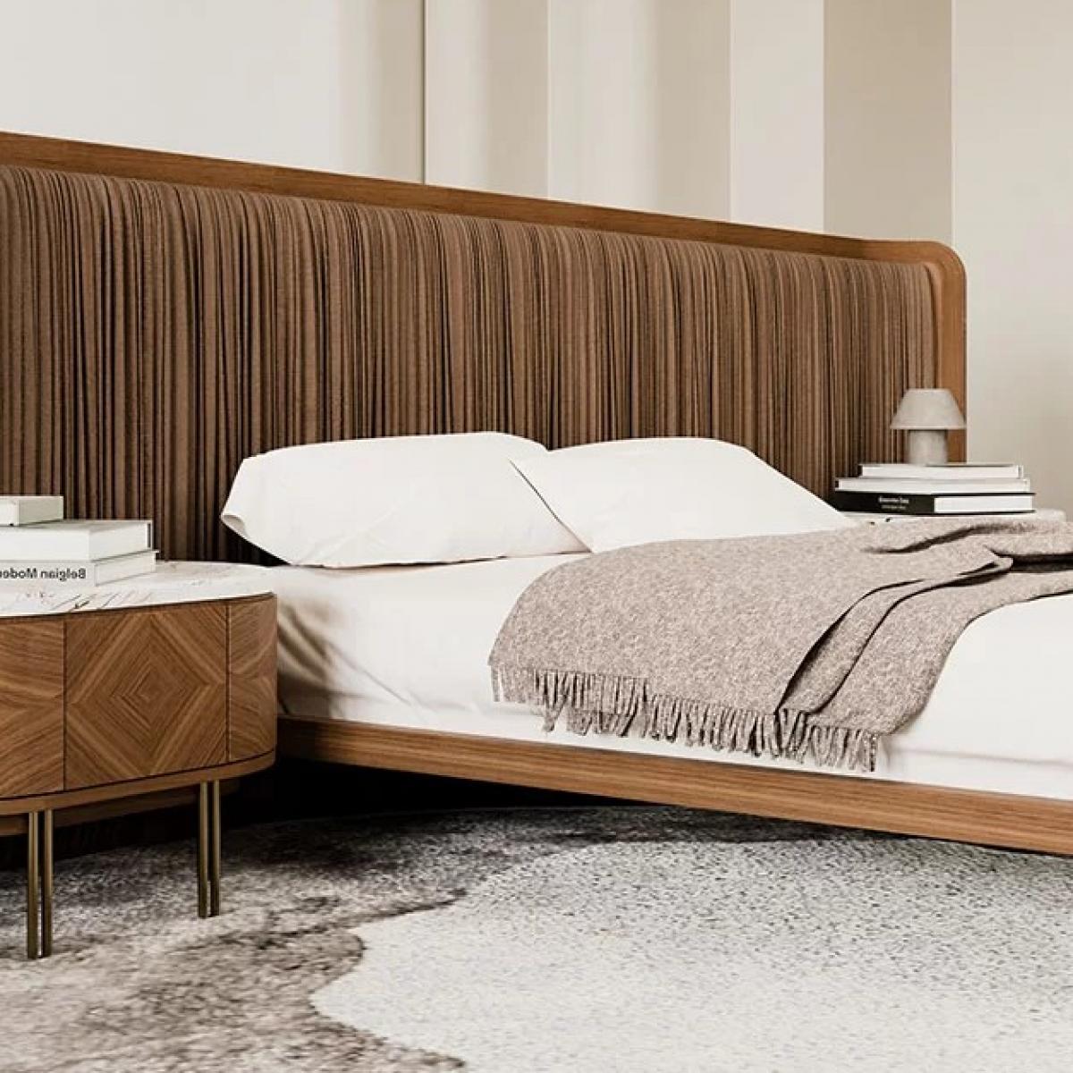 Luxury brown wooden pleated headboard hotel bed-luxury bedroom-hotel bed-bedroom furniture designed with oversized pleated headboard and premium wooden frame. This luxury bed offers hotel-style comfort and elegant modern appeal. Wide pleated headboard enhances visual sophistication. Premium craftsmanship ensures durability and stability. Ideal for luxury bedrooms, hotels, and designer interiors