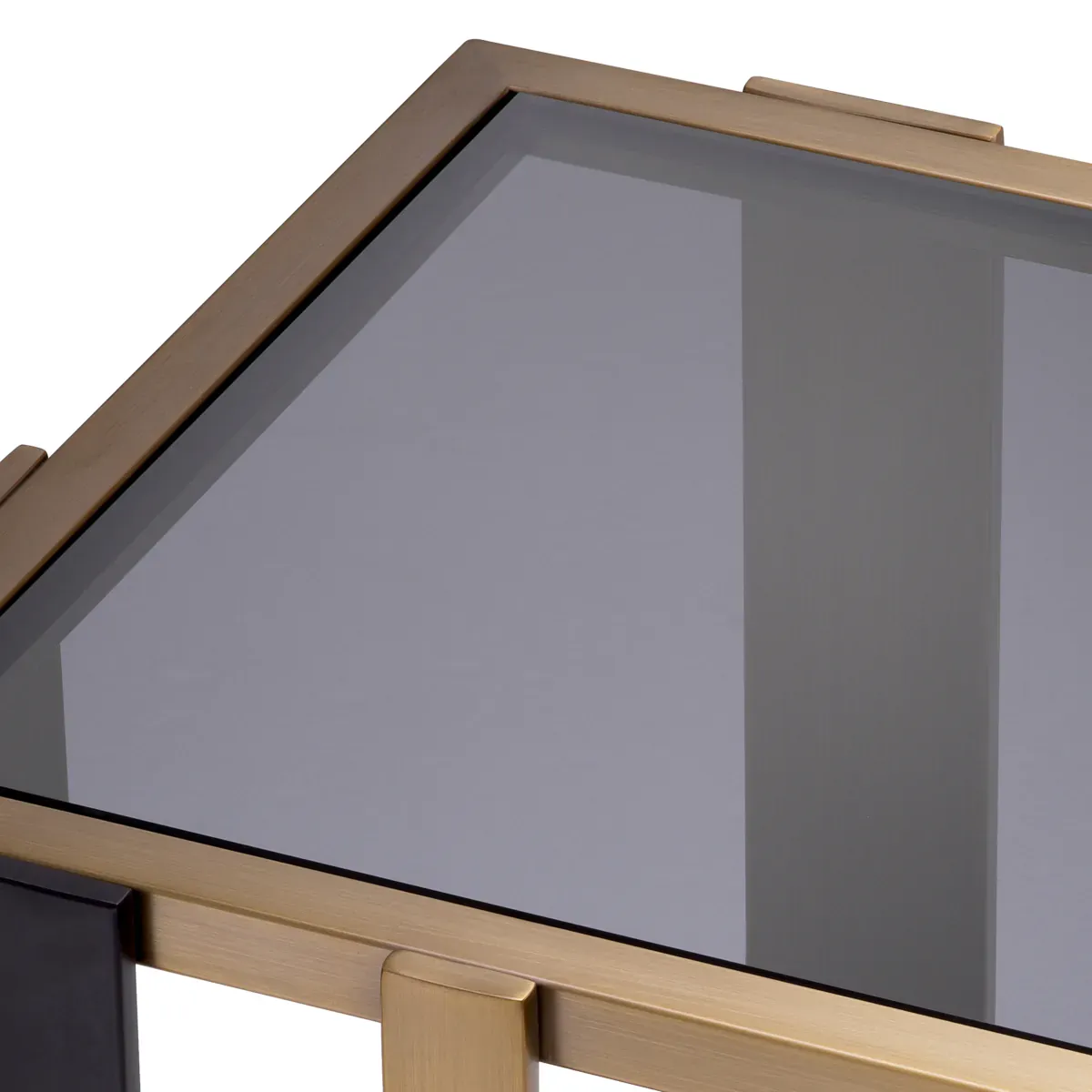 Luxury brushed brass side table with black glass shelves featuring architectural square form