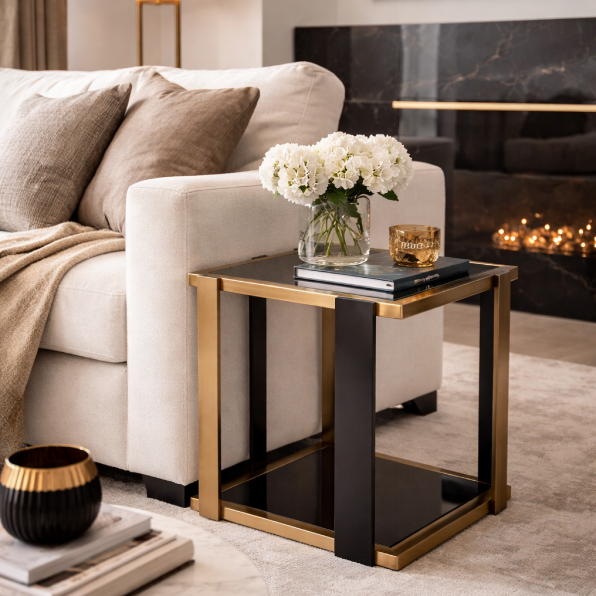 The luxury brushed brass side table with black glass shelves is a refined expression of modern European craftsmanship. Designed with a striking geometric frame, the brushed brass structure contrasts beautifully against deep black tempered glass shelves, creating a bold yet elegant visual statement. The clean square proportions and precise metal detailing showcase architectural sophistication, while the dual-tier design enhances both functionality and aesthetic appeal. Every line is intentional, every finish meticulously executed, making this piece a true accent of contemporary luxury.