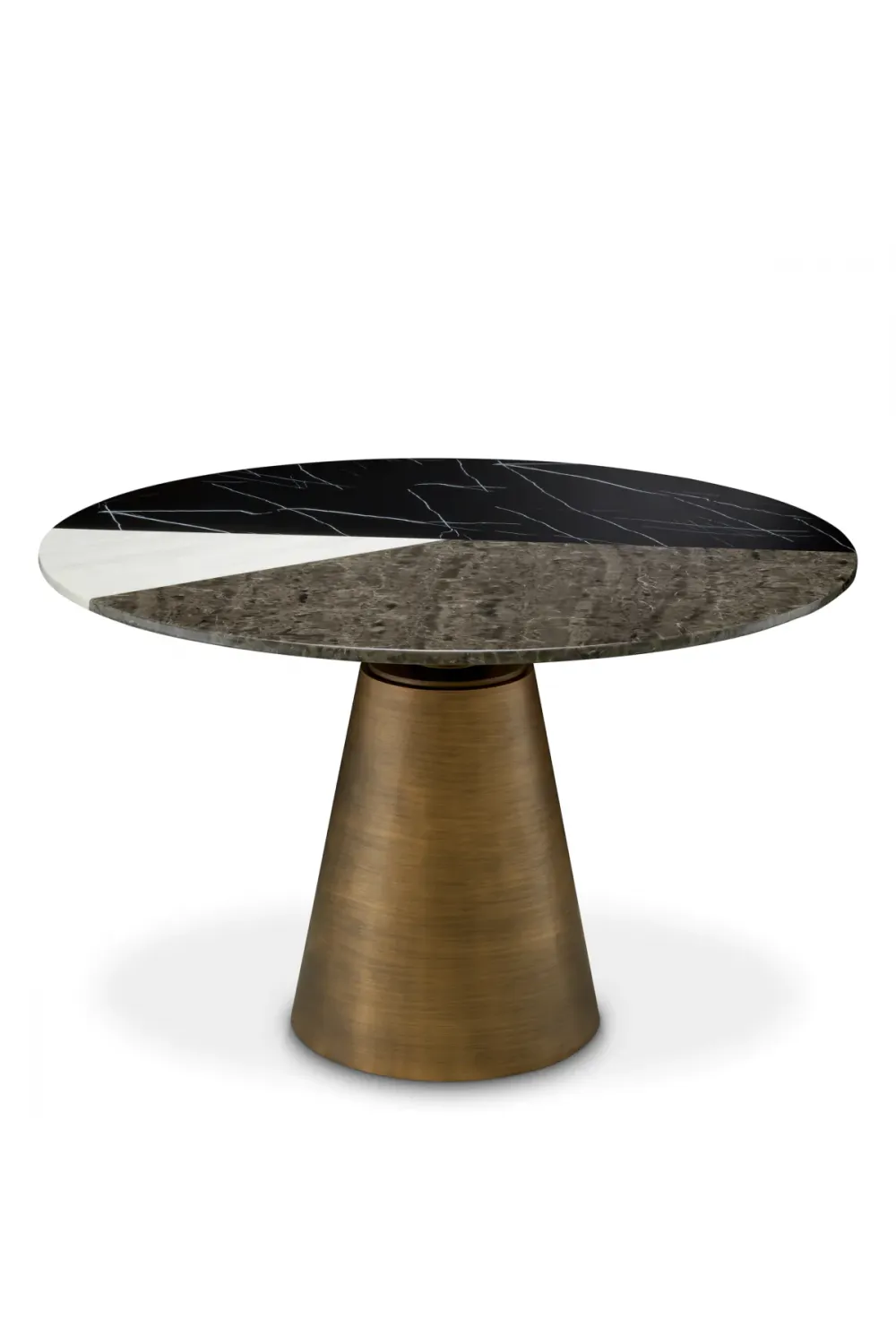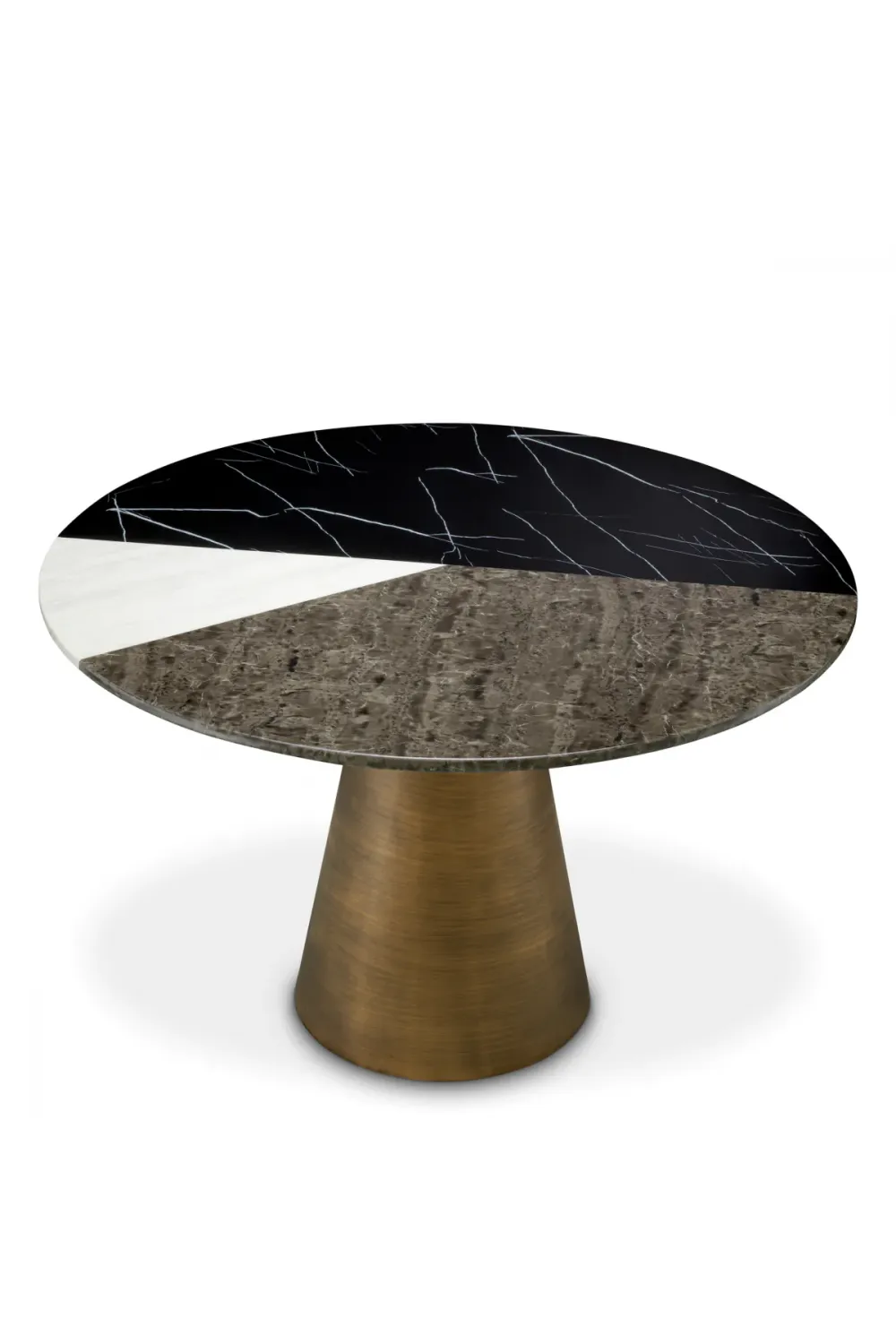 Round Dinning Table with Tri Color Faux Marble Top designed to make a sophisticated statement in elevated interiors. This luxury dinning table combines a sculptural brushed copper pedestal base with a striking marble-inspired surface, delivering refined contrast and timeless European elegance for contemporary dining spaces.