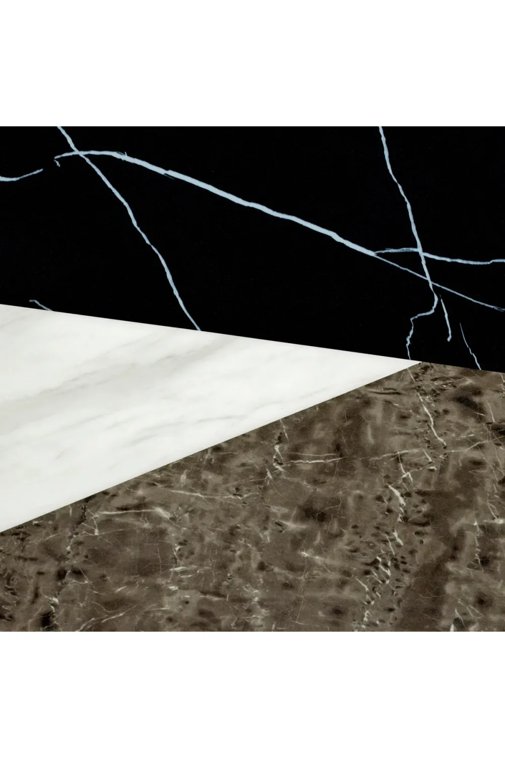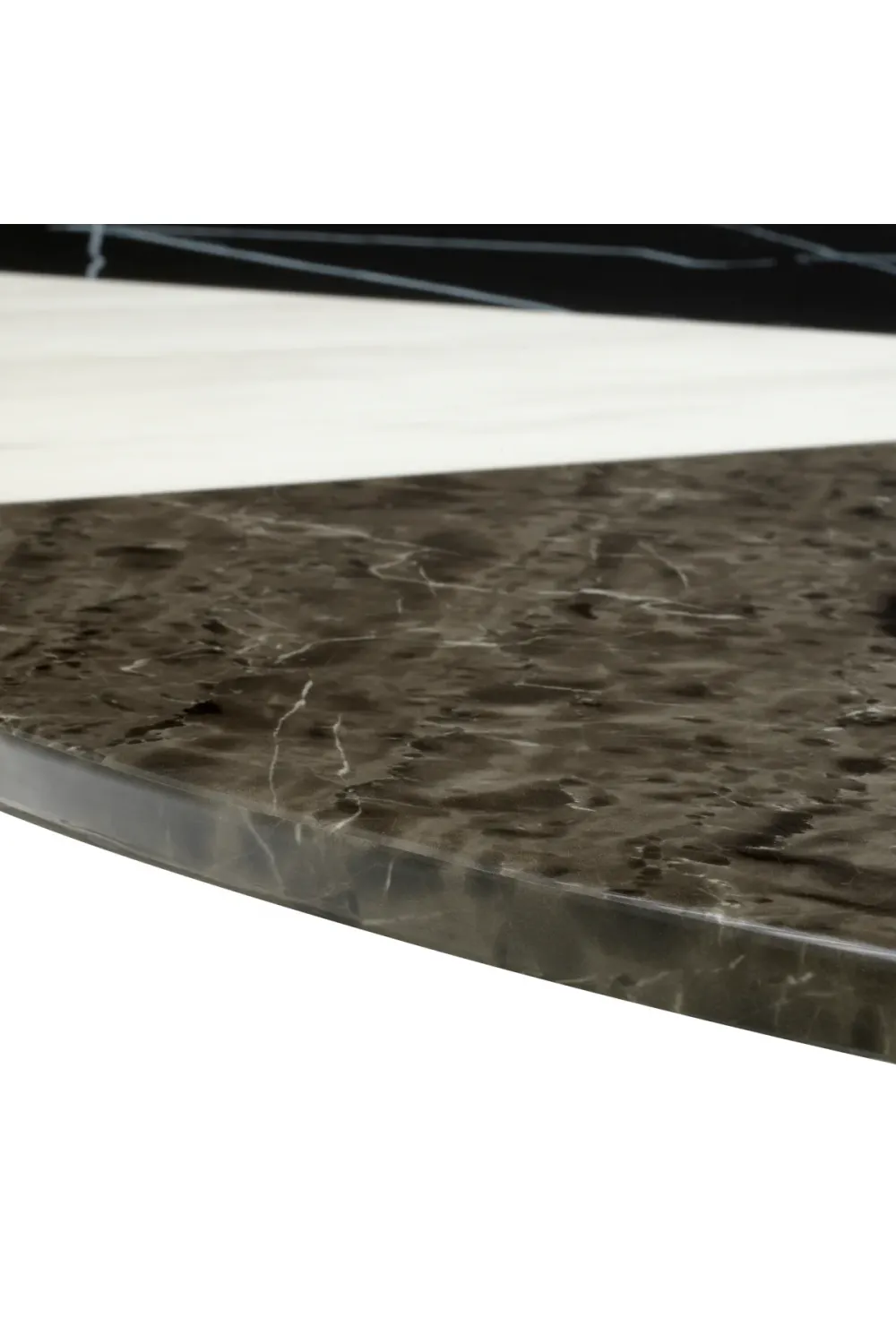 The tabletop is crafted with a striking tri-surface composition, making it a distinctive dinning table with tri-color faux marble top. Each section reflects a carefully curated marble-inspired tone, offering visual intrigue while maintaining a cohesive and balanced aesthetic. The faux marble finish delivers the elegance of natural stone with enhanced durability and consistency, ideal for refined dining settings.