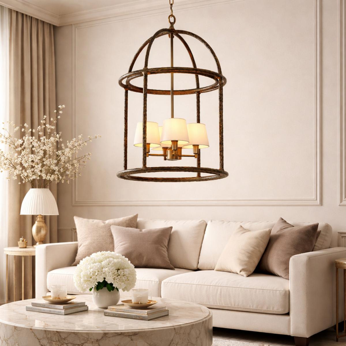 Elevate your space with Luxury Chandelier in Vintage Brass with Birdcage Frame & 4 White Shades. The vintage-inspired brass frame and soft white shades create warm, flattering light. Ideal for dining rooms and entryways where you want a refined focal point.