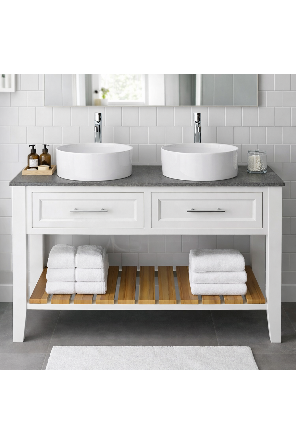 This double basin washstand is designed to support shared bathroom use through a wide countertop, dual basins, and two spacious drawers. Crafted as a designer double drawer washstand, it offers balanced proportions and practical organization for refined, larger bathroom interiors.