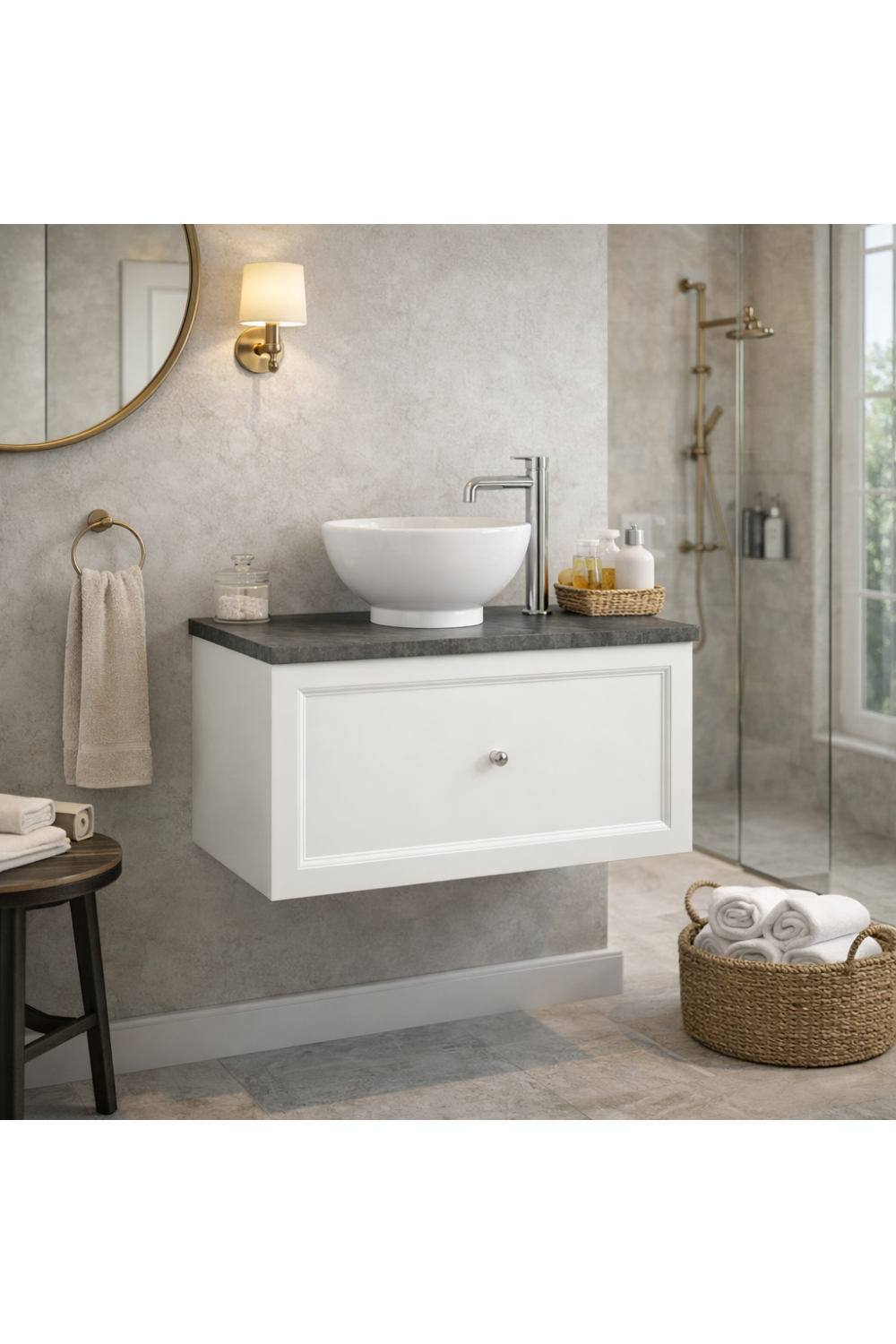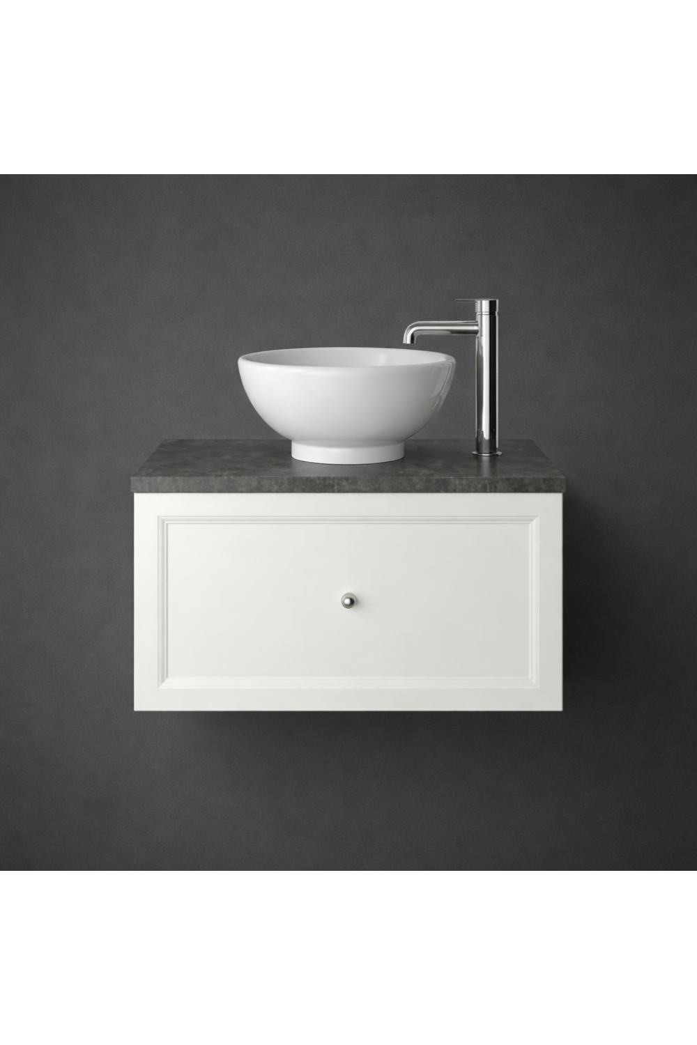 A refined wall hung one drawer vanity in an elegant Chantilly classic white finish, designed for contemporary European bathrooms. This designer one drawer vanity unit offers streamlined storage and durable craftsmanship, making it a timeless choice among luxury cabinets for bathroom interiors.