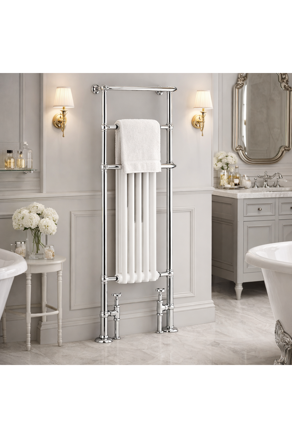 Designed to integrate seamlessly within curated collections of luxury bathroom radiators, this towel rail allows homeowners to achieve a cohesive and well-balanced heating scheme. Whether paired with matching traditional radiators or styled alongside complementary options such as the Luxury Chrome Floor Mounted Heated Towel Rail with Integrated Black Column Radiator – 94 CM, it offers flexibility in layout while maintaining consistent craftsmanship, finish, and thermal performance.