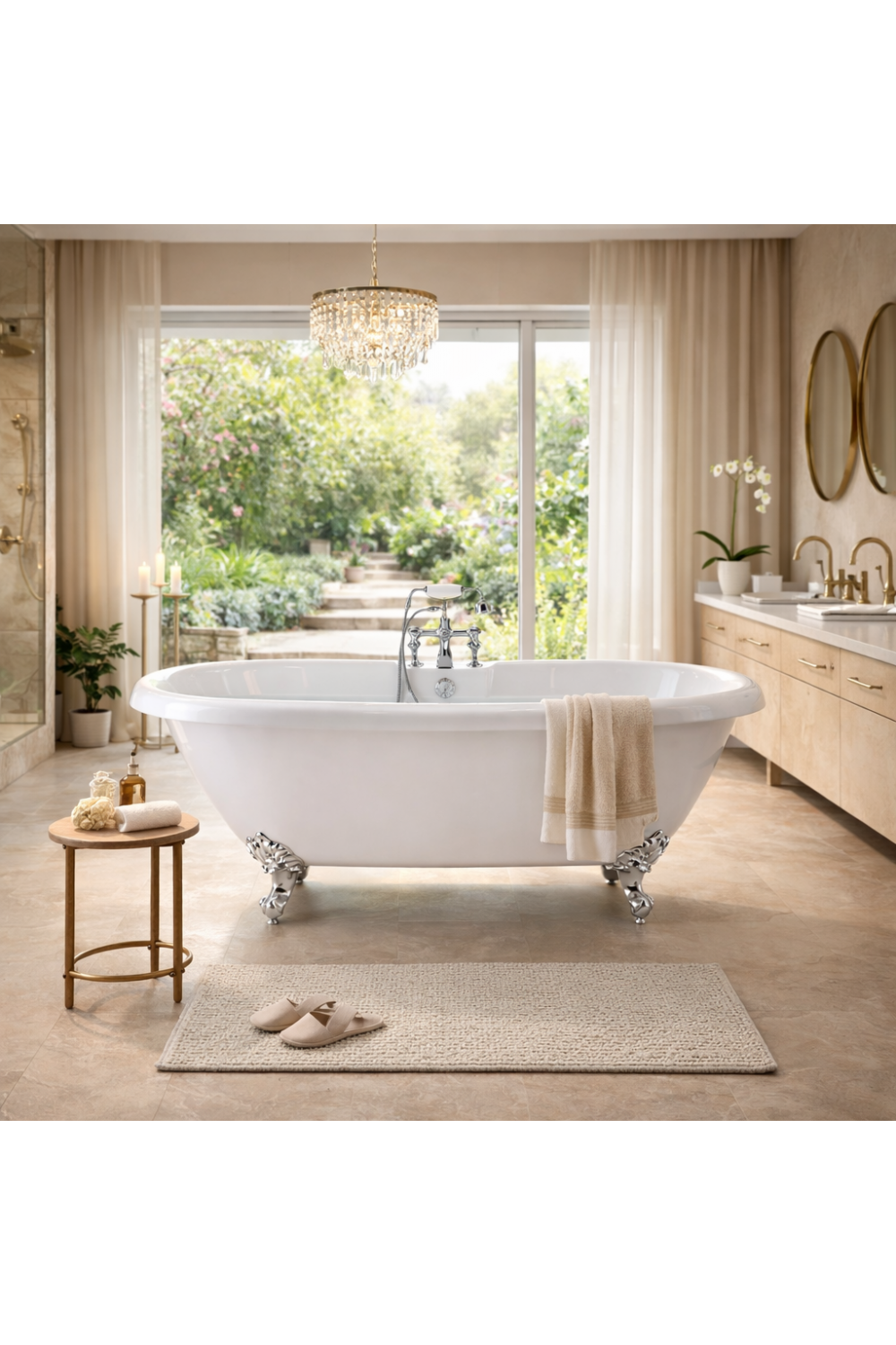 Luxury Classic Double Ended Roll Top Freestanding Bathtub in White Acrylic embodies timeless elegance through its softly curved roll-top edges and perfectly balanced double-ended form. Designed to elevate refined interiors, it delivers a composed and indulgent bathing experience, establishing itself as a sophisticated luxury bathtub suited to classic European homes and contemporary reinterpretations alike.