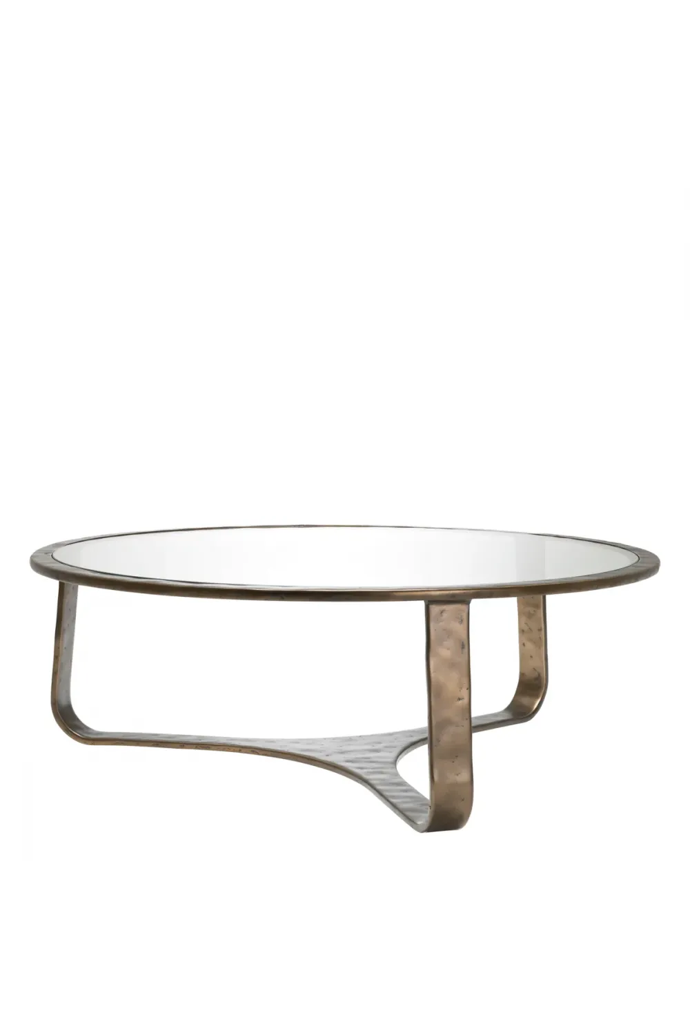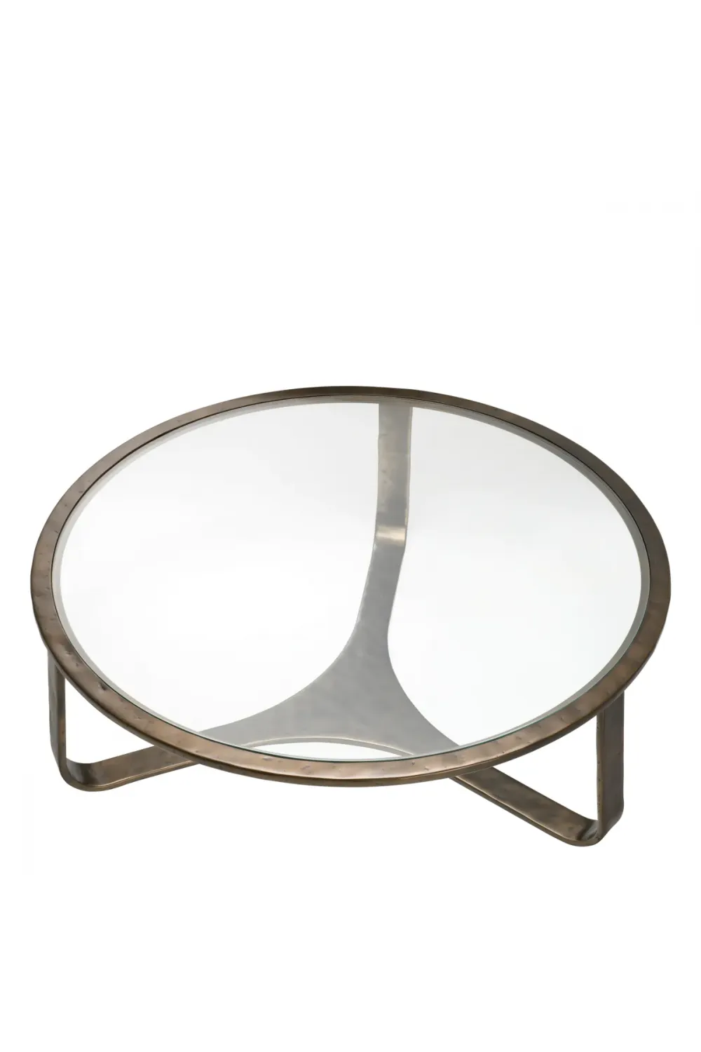 Clear glass top round coffee table in Bronze finished frame showcases a finely hammered cast aluminum base paired with a sleek transparent surface. Designed as a luxury coffee table, it balances visual warmth with structural refinement. The clear glass top enhances spatial openness while highlighting the artisanal bronze finish beneath. Ideal as a modern glass coffee table for modern interior styling. Crafted for sophisticated European living spaces.