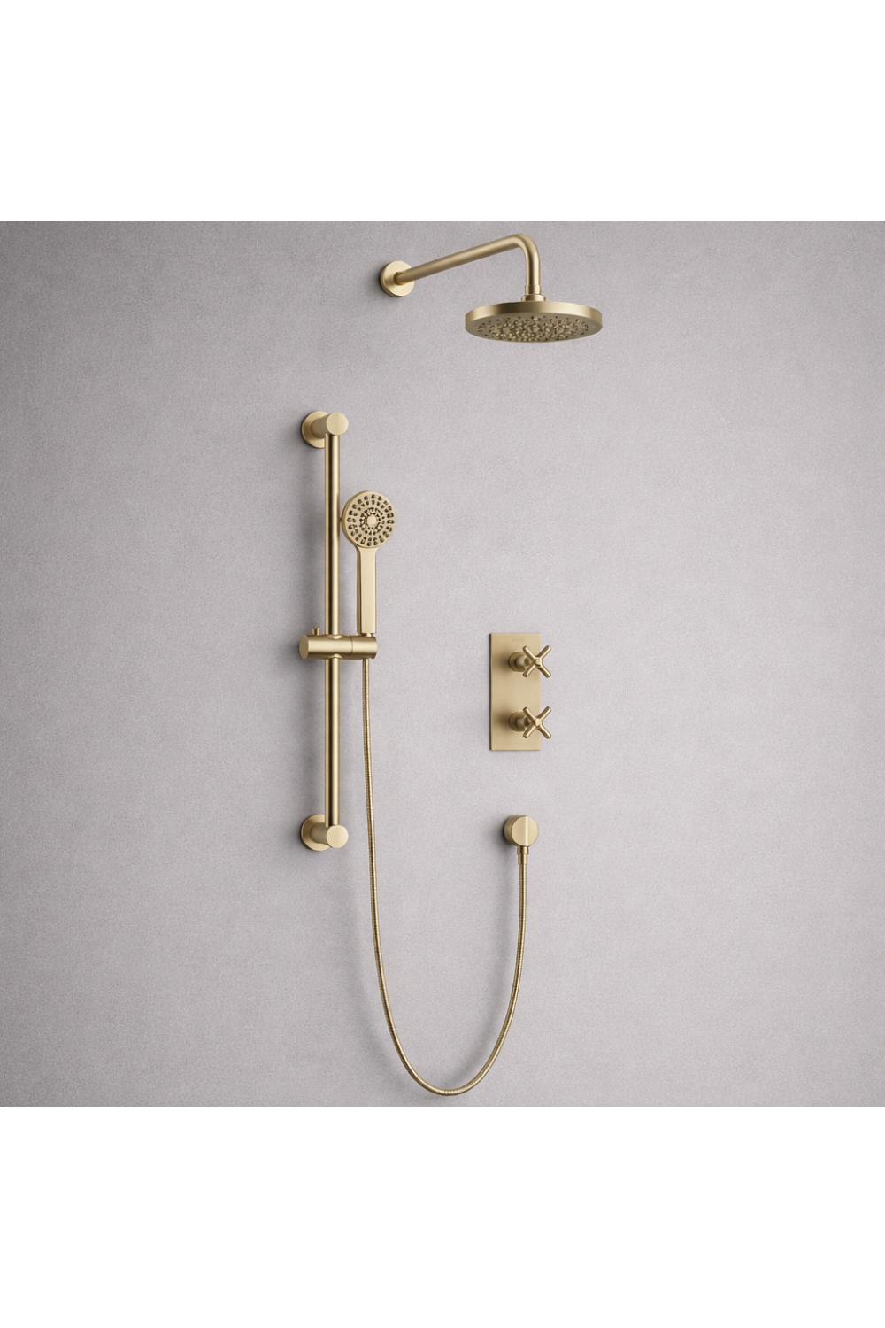 The Luxury Concealed 2 Handle Thermostatic Shower Valve with Fixed Head & Multi-Function Handset in Brushed Brass Finish seamlessly combines elegance with performance. This premium shower system includes a 200mm round fixed shower head with a wall arm, complemented by an adjustable riser kit with a multi-function handset. The dual controls allow you to independently adjust both the water flow and temperature, while thermostatic control ensures a stable and safe shower experience by preventing sudden temperature fluctuations. The brushed brass plated riser shower adds a luxurious, warm aesthetic to your bathroom, transforming it into a refined space.