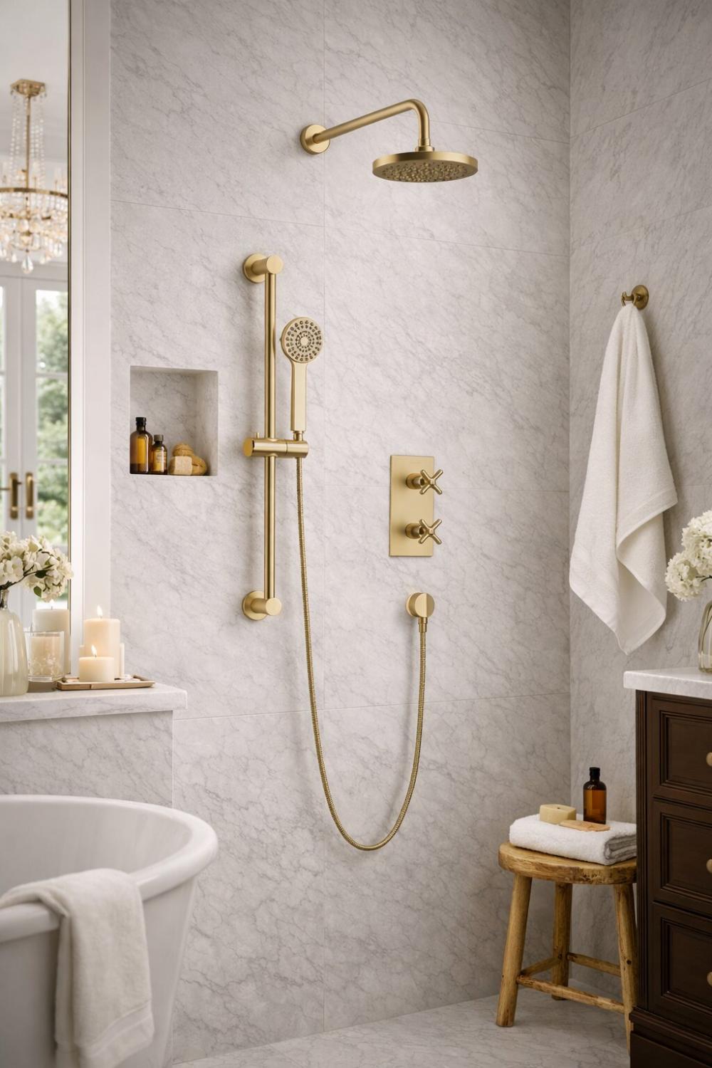 Enhance your shower experience with the luxury thermostatic dual control shower featuring a brushed brass plated riser shower. Dual controls offer precise water flow and temperature adjustment, while the multi-function handset adds flexibility to your shower routine.