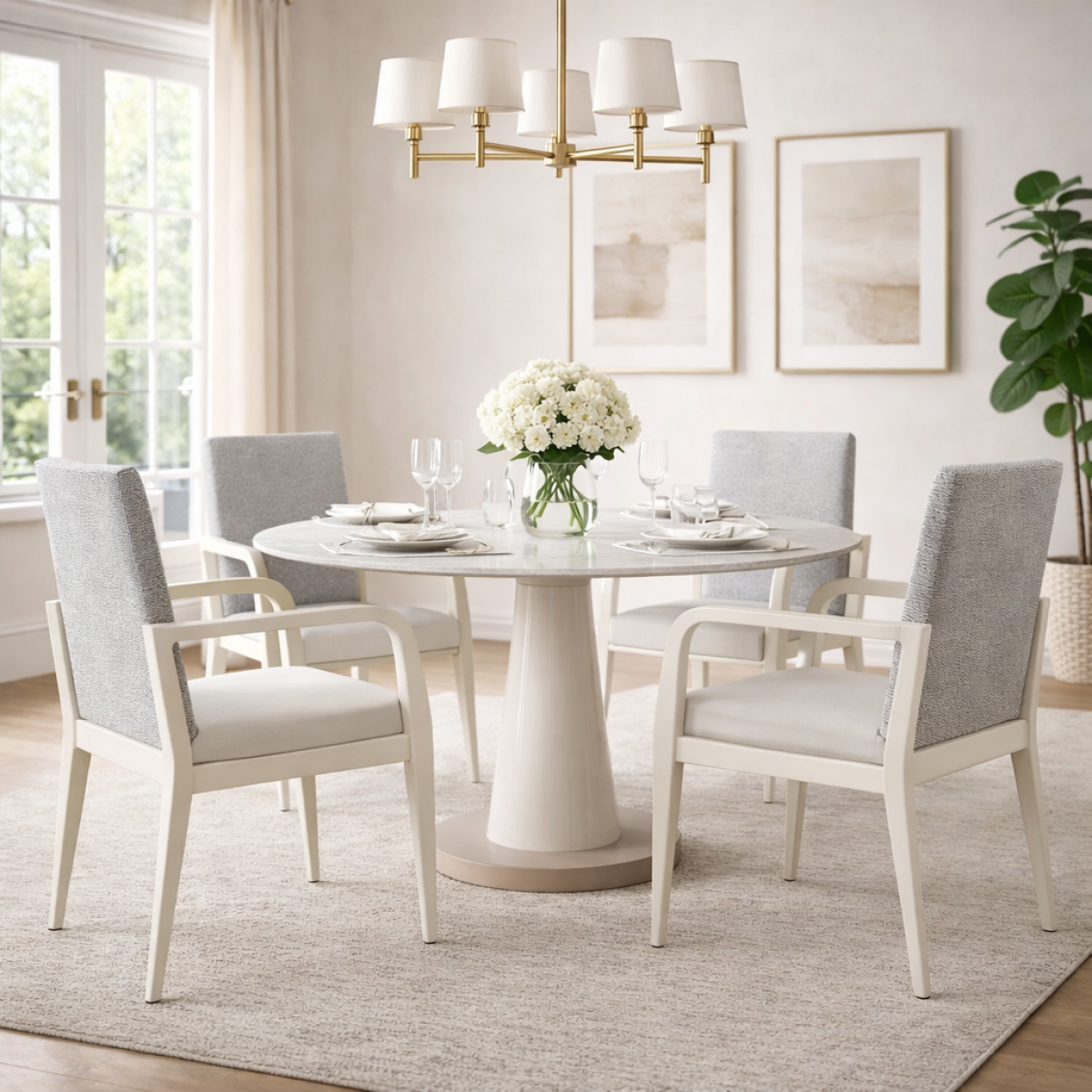 When styled with statement luxury dining tables, this armchair completes a cohesive and refined dining composition. The contrast between the gray backrest and white frame enhances both modern and transitional interiors, creating a welcoming yet sophisticated atmosphere. Within the curated vision of our luxury group, each piece is thoughtfully designed to harmonize in material, proportion, and aesthetic language—allowing European clients to craft interiors that feel unified, elegant, and timeless.