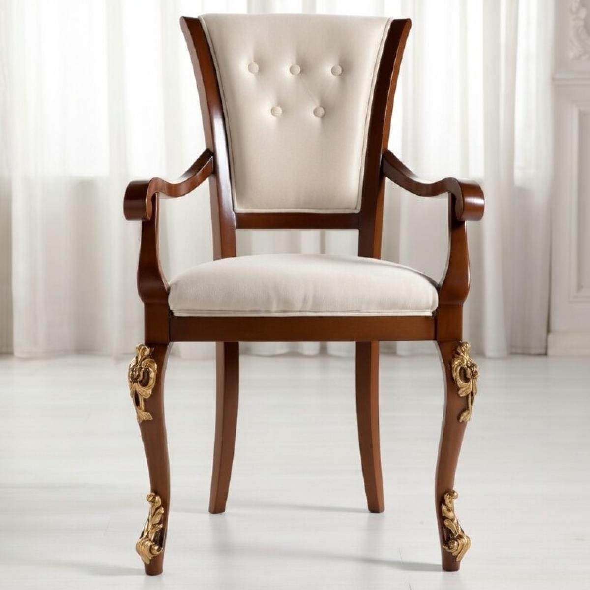 This luxury upholstered dining armchair features a smooth cream fabric backrest with five-button tufting and a matching cream padded seat, set within a warm walnut hardwood frame with elegant open scroll armrests. Gold sculpted ornamental carvings at the knee and foot of each front leg make this a distinguished luxury armchair for dining room settings from our luxury dining armchairs collection.