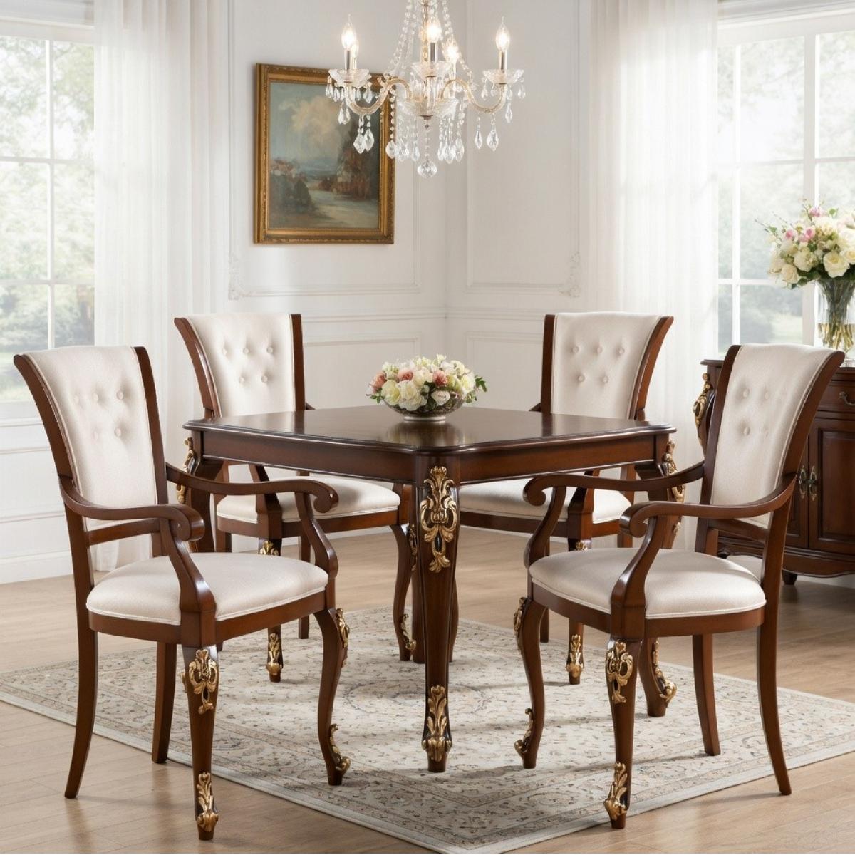 The Luxury Cream Upholstered Dining Armchair with Button-Tufted Backrest & Gold Sculpted Wooden Legs is a refined and graceful carver chair that unites the clean simplicity of cream upholstery with the warmth of walnut woodwork and the richness of gold sculpted ornamental detail. This luxury upholstered dining armchair presents a gently flared backrest upholstered in smooth, plain cream fabric, detailed with a five-button tufting arrangement — two buttons above, three below — lending the backrest a tailored, quietly sophisticated character. The generously padded seat is upholstered in the same matching cream fabric, creating a clean and cohesive look from seat to back. The solid hardwood frame is finished in a warm walnut tone and extends into smooth open scroll armrests, gently curved and polished, offering a natural and comfortable resting position. The front cabriole legs carry boldly detailed gold sculpted ornamental carvings at both the knee and the foot — a striking double-placement detail of genuine European artisan craftsmanship that gives this armchair a confident and commanding presence at any dining table.