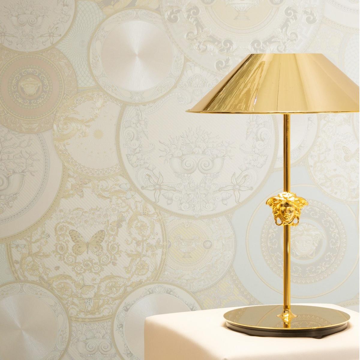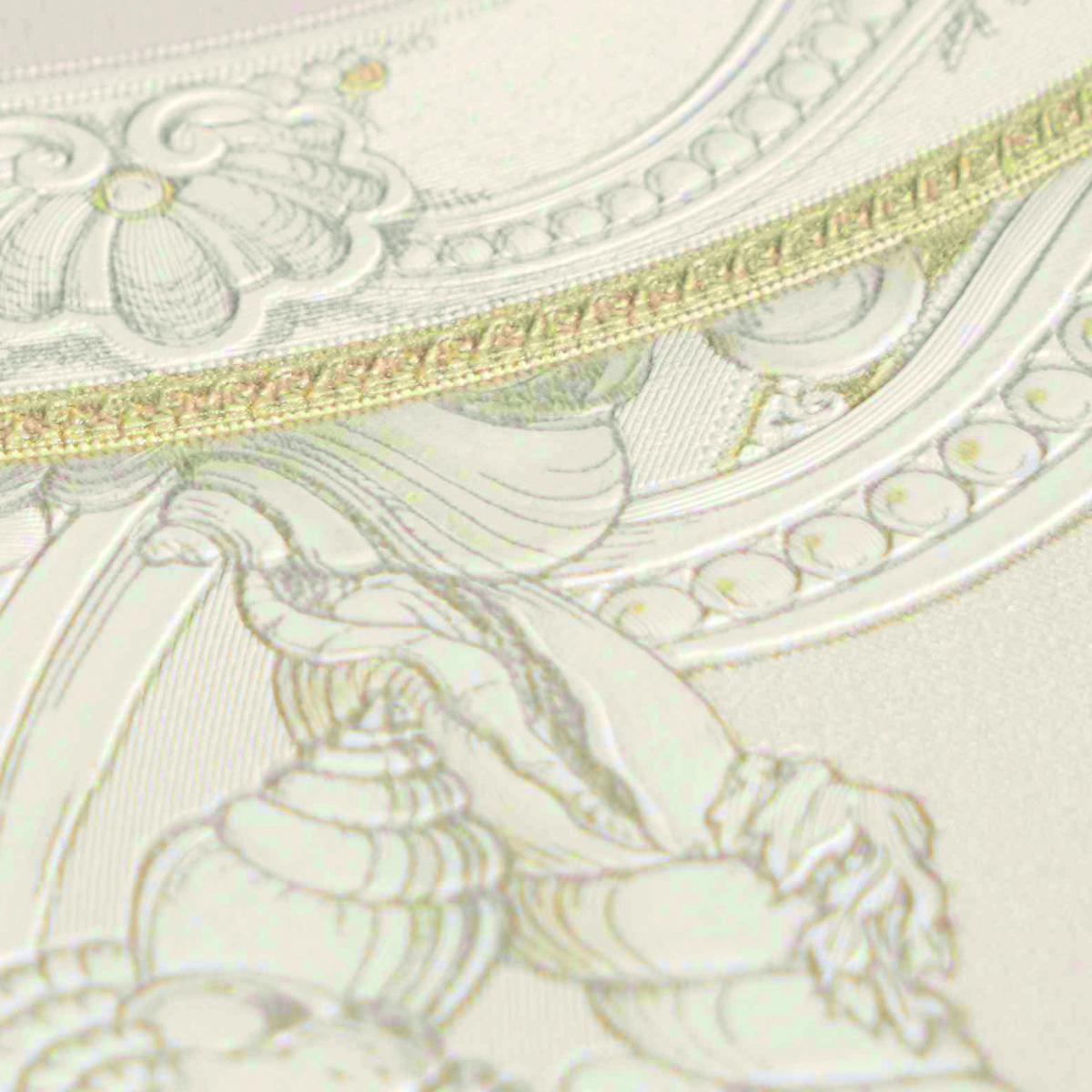 luxury designer wallpaper featuring elegant baroque motifs and decorative medallion plates in refined cream and white tones. This sophisticated baroque designer wallpaper creates a timeless luxury wall covering inspired by Versace interiors, ideal for premium home décor and luxury hospitality spaces.
