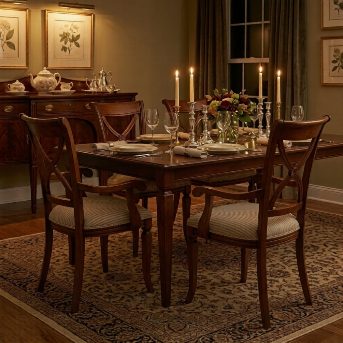 Elegant luxury upholstered dining armchairs featuring a cross-back wooden frame and striped cream upholstered seat. These refined wooden dining armchairs combine classic craftsmanship and comfort, making them ideal luxury armchairs for dining room interiors.