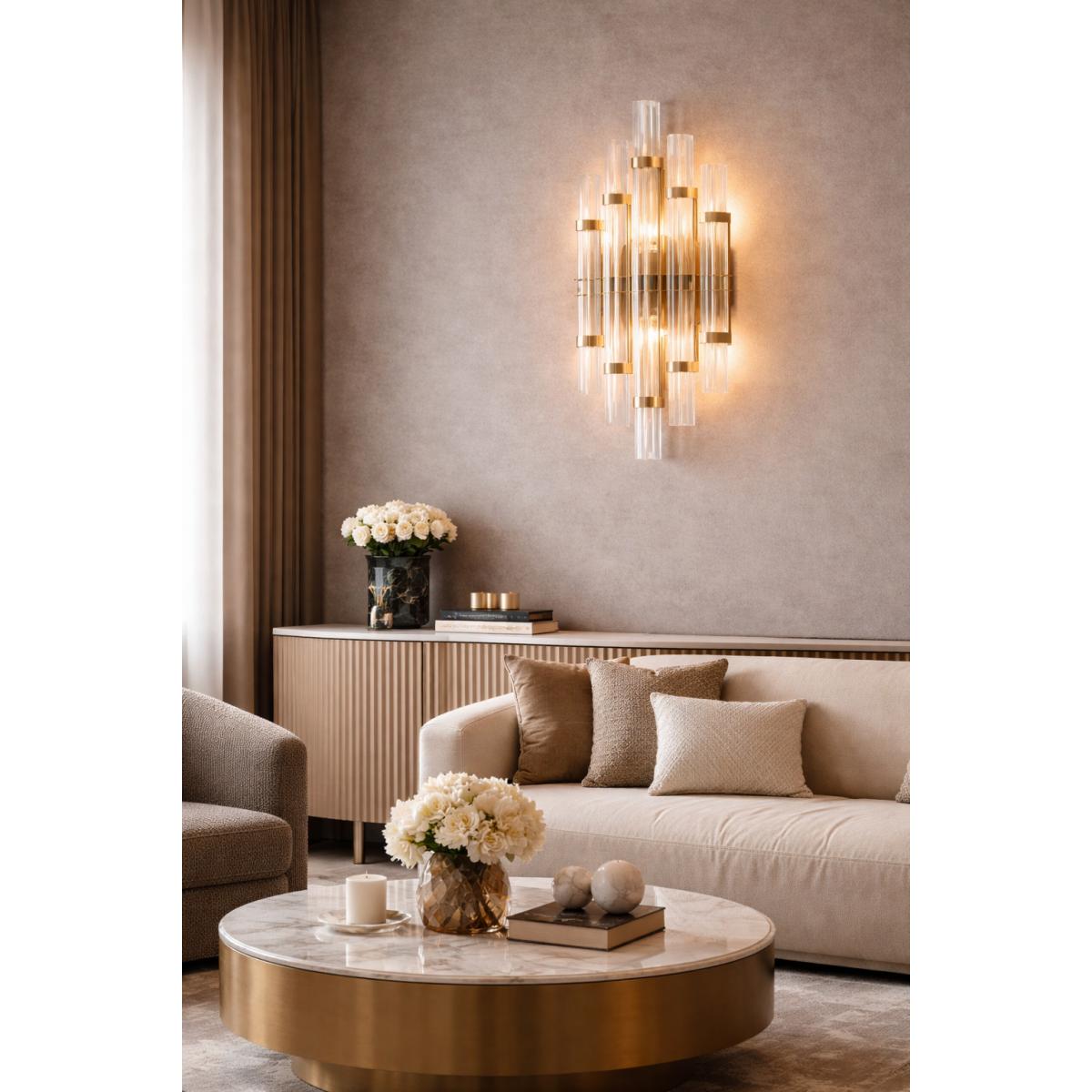 The Luxury Crystal Modern Designer multiple Glass rod Wall Lamp Golden frame also pairs beautifully with interiors styled using luxury hotel furniture, bringing a refined hospitality ambiance into residential environments.