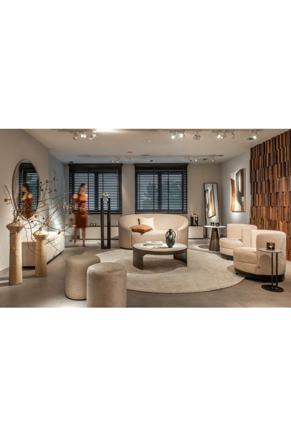 Style: Contemporary curved sofa with sculptural silhouette