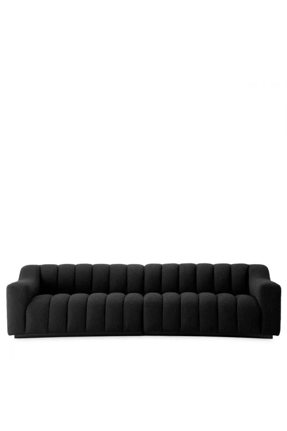Curved Upholstered long sofa designed with deep channel stitching and a sculptural silhouette that adds refined elegance to modern interiors. Soft contours create an inviting, enveloping seat with generous comfort, while premium upholstery reflects European craftsmanship. Structured cushioning ensures lasting support, and a sleek black base introduces architectural contrast for a timeless, sophisticated living space.