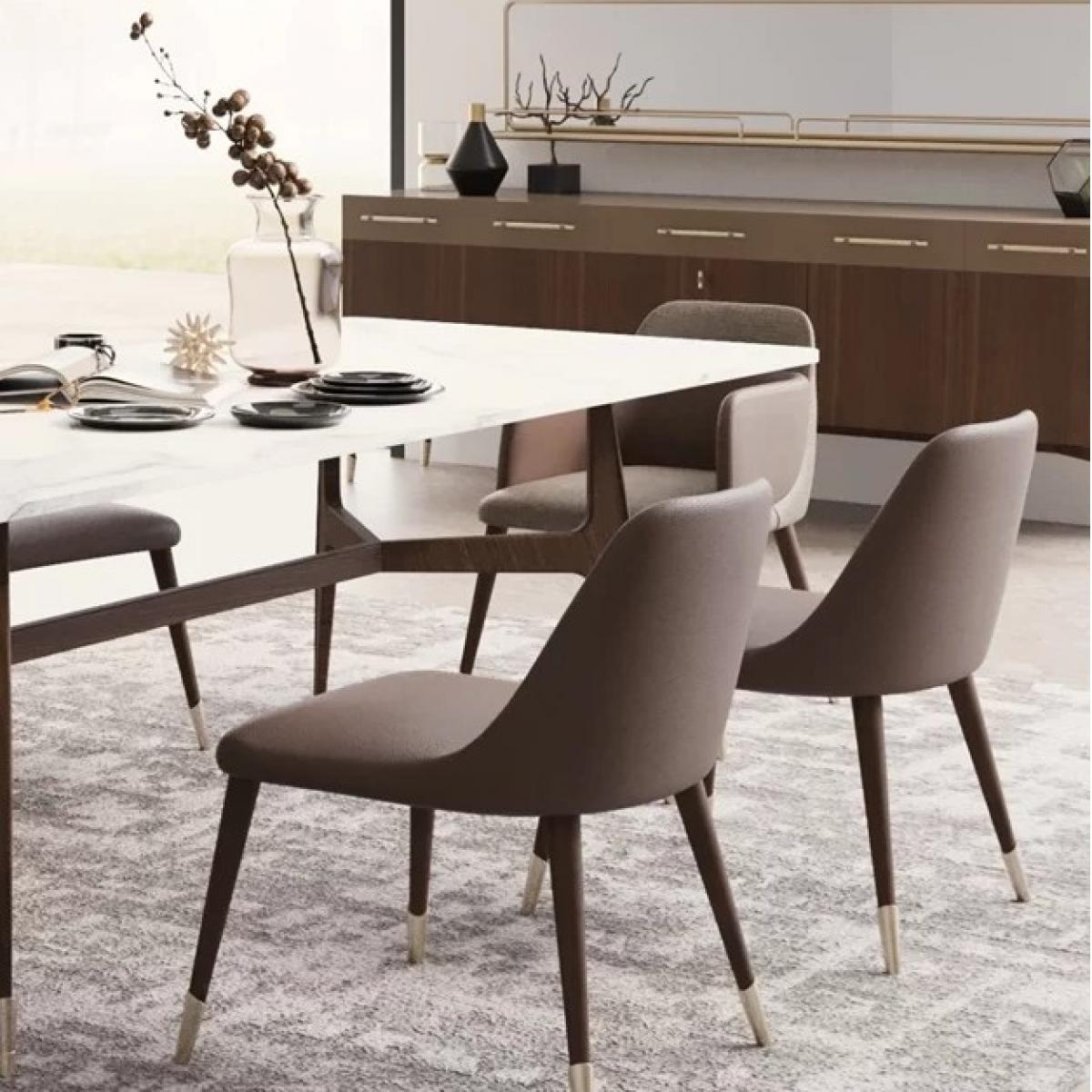 The luxury dark brown modern dining chair offers a combination of modern design and exceptional comfort. The chair is upholstered in a rich brown fabric, providing both a durable and stylish finish. Its dark wood frame adds sturdiness while complementing the deep brown upholstery. The metallic gold accents at the tips of the tapered legs give the chair an elegant and refined look, making it perfect for high-end interiors.