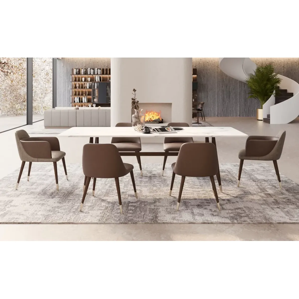 Its ergonomic design ensures comfort for long durations, making it a great choice for luxury dining rooms or contemporary living rooms. The combination of brown upholstery and gold metallic accents makes it versatile and easily incorporated into modern, sophisticated interiors.