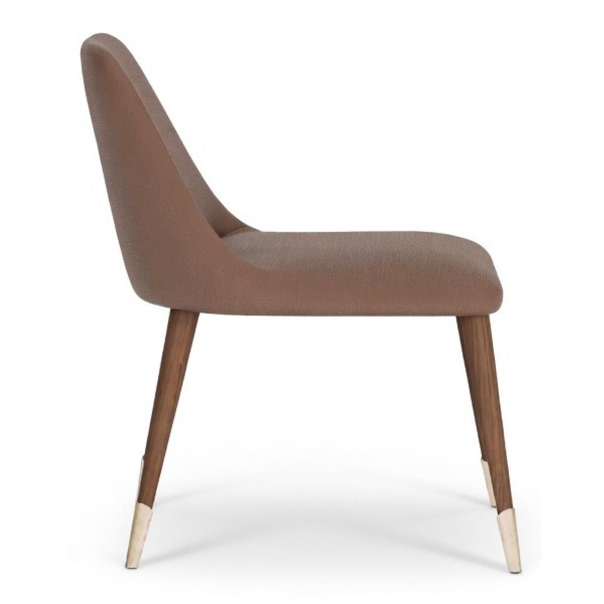 This luxury dining chair in dark brown features a comfortable upholstered fabric seat with sleek, tapered wooden legs. The dark wood frame is complemented by metallic gold accents, offering a refined touch. Ideal for luxury dining rooms, this luxury dining chair combines style, durability, and ergonomic comfort.