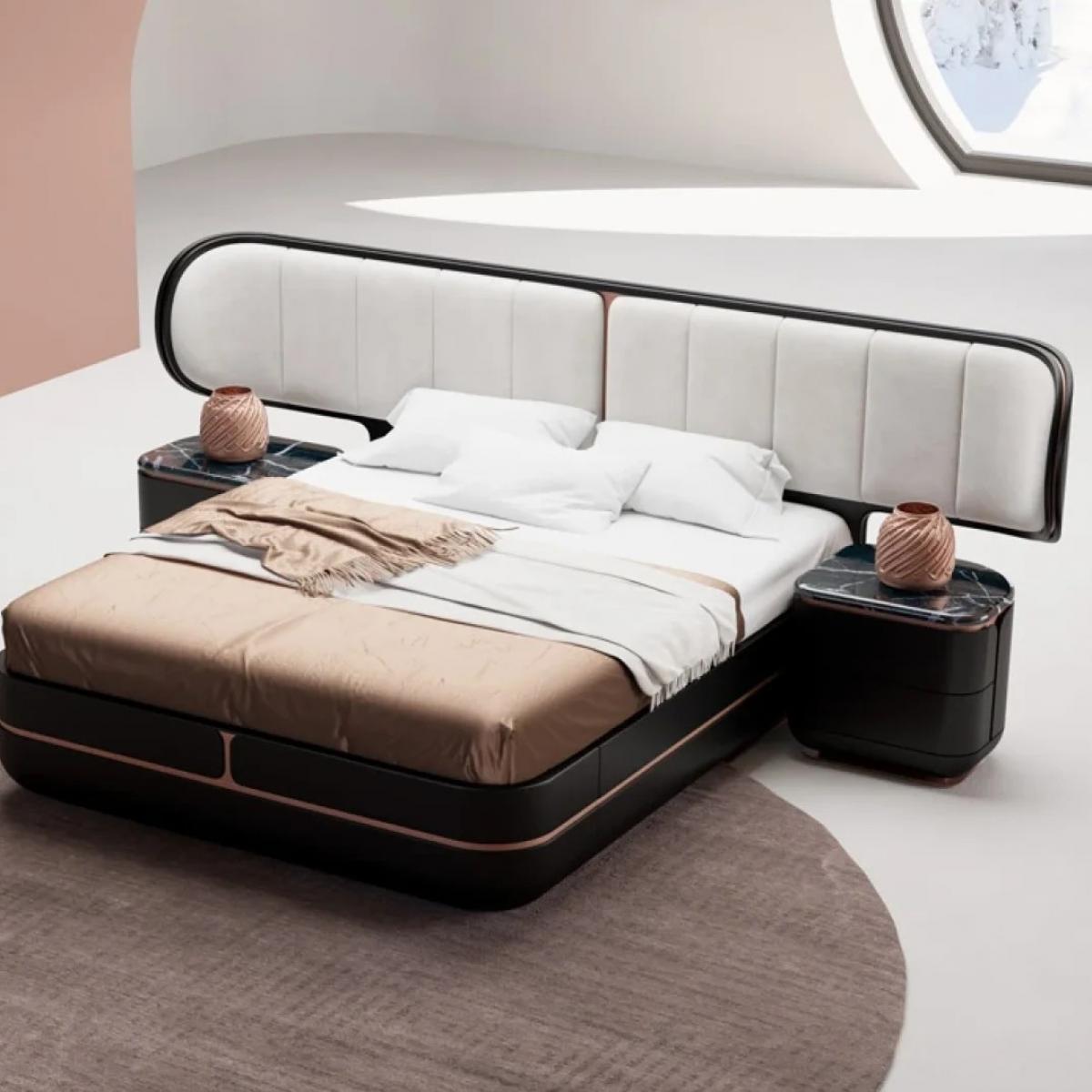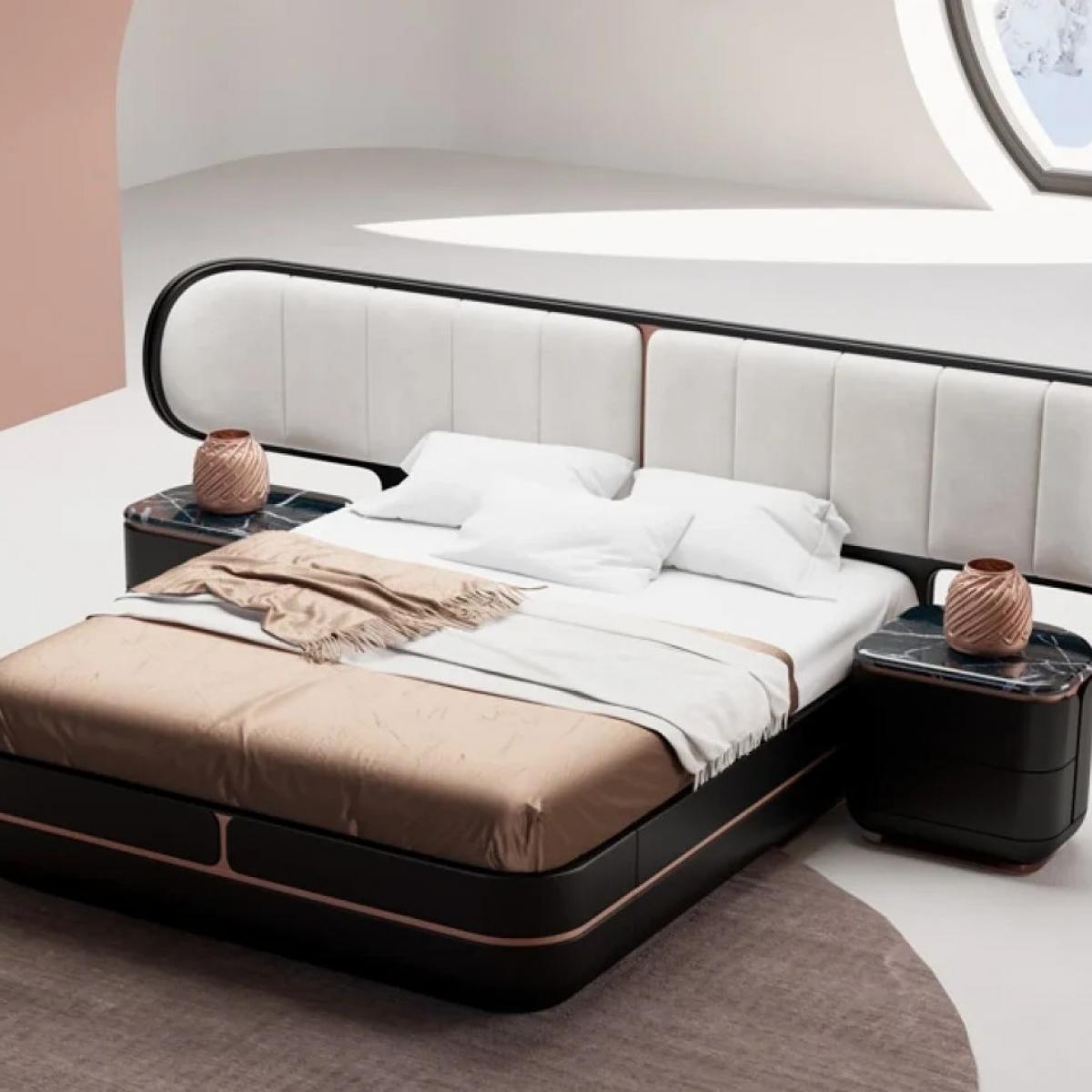 Crafted to complement modern interiors, this modern bed design with upholstered headboard delivers both functionality and visual appeal. The extended headboard enhances hotel bed aesthetics, making it ideal for luxury residences, hotels, and premium apartments. The black frame combined with subtle copper detailing creates a refined contrast, while the upholstered panel introduces softness and comfort. Designed with attention to detail, this luxury bed balances comfort and modern elegance.