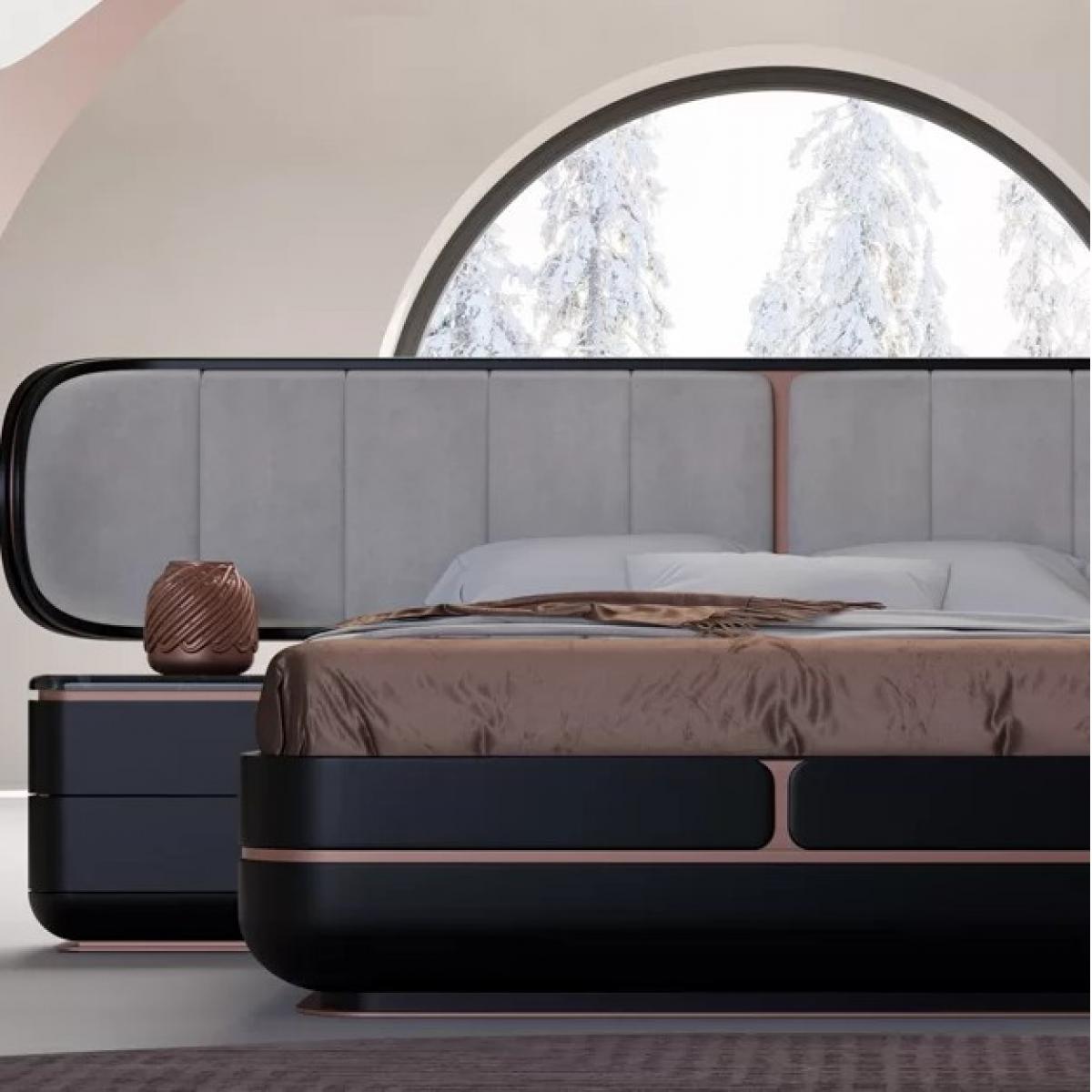 The Luxury Double Bed Gray / Black / Copper - Solid Wood Bed with Upholstered Headboard showcases refined European craftsmanship with a bold architectural presence and premium comfort. Designed with a wide upholstered headboard framed in elegant black and copper accents, this Luxury Double Bed Gray / Black / Copper - Solid Wood Bed with Upholstered Headboard creates a striking focal point for modern bedrooms. The padded headboard enhances comfort while the smooth curved edges of the platform base introduce contemporary sophistication. Built with a solid wood structure and premium upholstery, this luxury bed offers durability, stability, and timeless elegance.