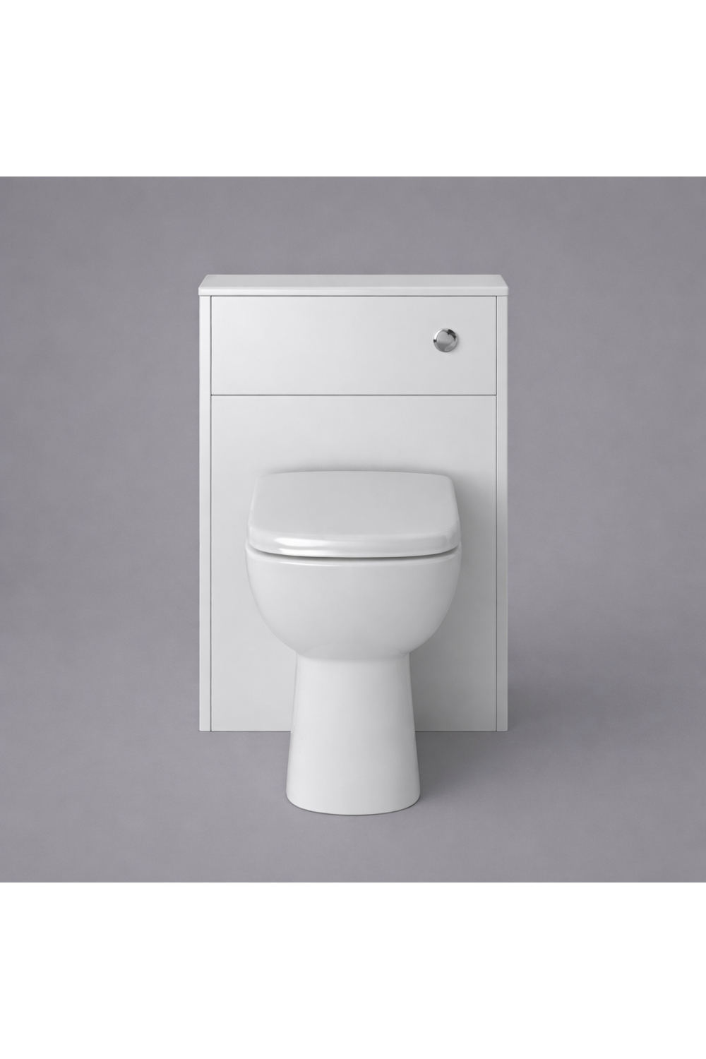 This elegant back-to-wall WC cabinet features a compact freestanding design in a refined Dove Grey finish with a painted worktop, offering concealed cistern storage and clean architectural lines as a premium freestanding toilet unit for modern luxury bathrooms.